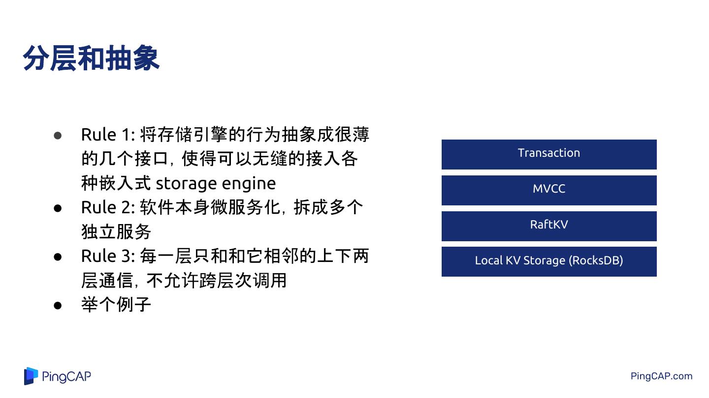 19 .分层和抽象 ● Rule 1: 将存储引擎的行为抽象成很薄 Transaction 的几个接口,使得可以无缝的接入各 种嵌入式 storage engine MVCC ● Rule 2: 软件本身微服务化,拆成多个 RaftKV 独立服务 ● Rule 3: 每一层只和和它相邻的上下两 Local KV Storage (RocksDB) 层通信,不允许跨层次调用 ● 举个例子 PingCAP.com