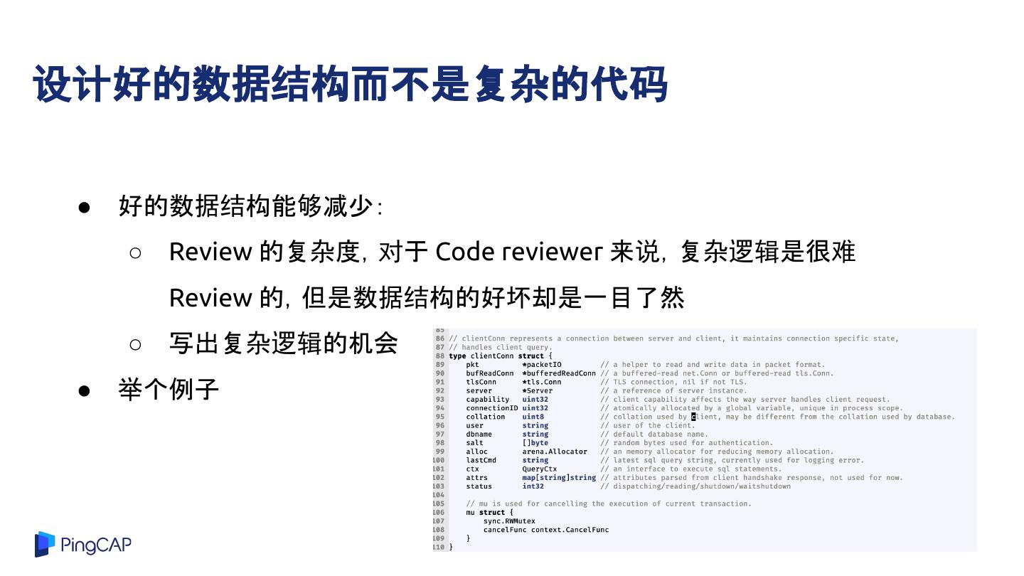 21 .设计好的数据结构而不是复杂的代码 ● 好的数据结构能够减少: ○ Review 的复杂度,对于 Code reviewer 来说,复杂逻辑是很难 Review 的,但是数据结构的好坏却是一目了然 ○ 写出复杂逻辑的机会 ● 举个例子