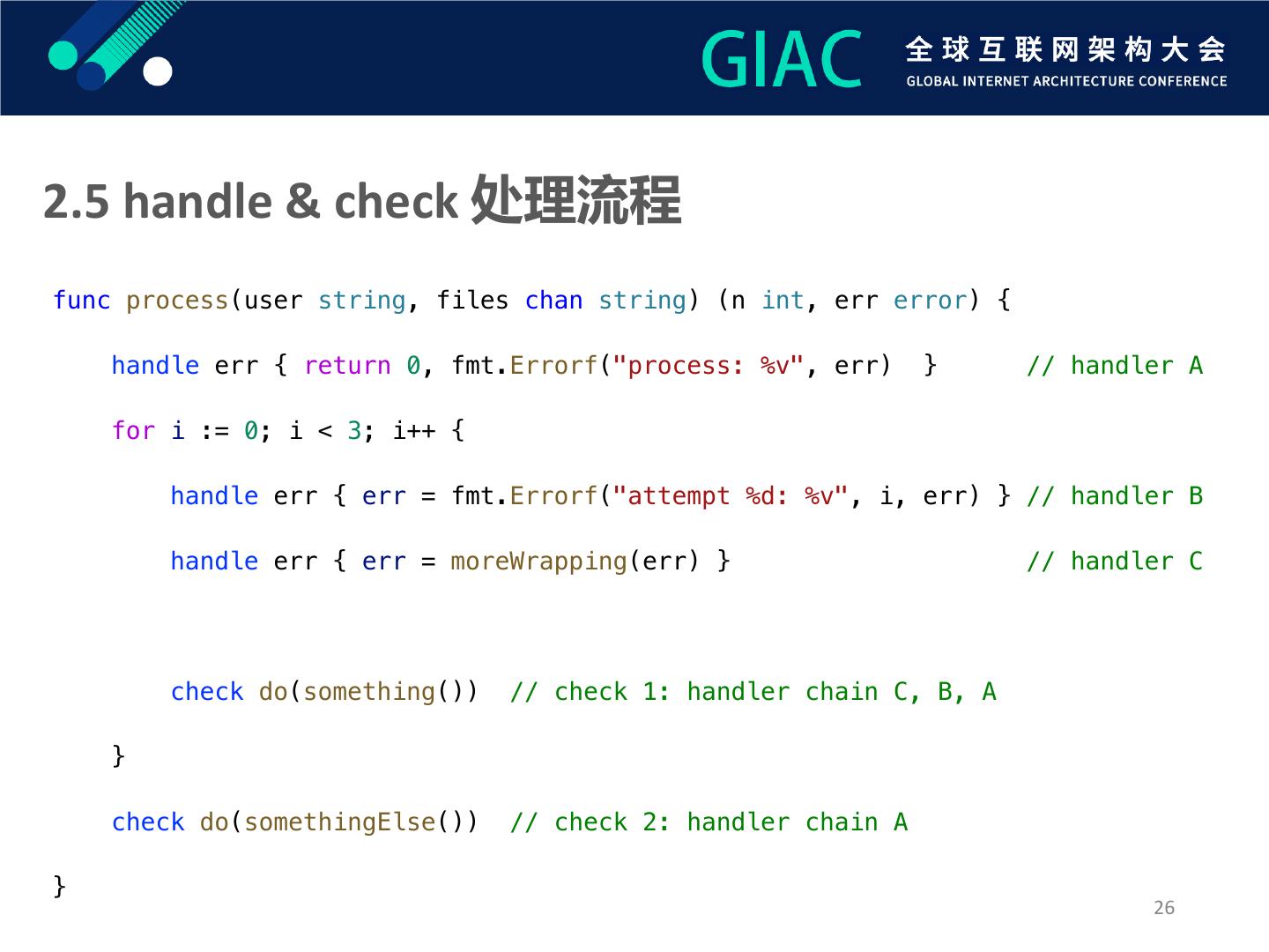 26 .2.5 handle & check func process(user string, files chan string) (n int, err error) { handle err { return 0, fmt.Errorf("process: %v", err) } // handler A for i := 0; i < 3; i++ { handle err { err = fmt.Errorf("attempt %d: %v", i, err) } // handler B handle err { err = moreWrapping(err) } // handler C check do(something()) // check 1: handler chain C, B, A } check do(somethingElse()) // check 2: handler chain A } 26