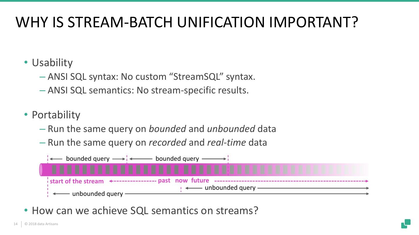 13 .WHY IS STREAM-BATCH UNIFICATION IMPORTANT? • Usability ‒ ANSI SQL syntax: No custom “StreamSQL” syntax. ‒ ANSI SQL semantics: No stream-specific results. • Portability ‒ Run the same query on bounded and unbounded data ‒ Run the same query on recorded and real-time data bounded query bounded query start of the stream past now future unbounded query unbounded query • How can we achieve SQL semantics on streams? 14 © 2018 data Artisans