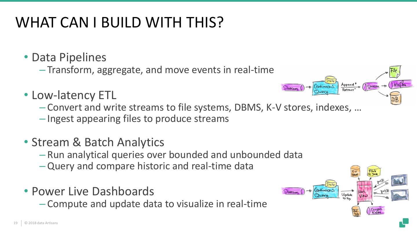 18 .WHAT CAN I BUILD WITH THIS? • Data Pipelines ‒ Transform, aggregate, and move events in real-time • Low-latency ETL ‒ Convert and write streams to file systems, DBMS, K-V stores, indexes, … ‒ Ingest appearing files to produce streams • Stream & Batch Analytics ‒ Run analytical queries over bounded and unbounded data ‒ Query and compare historic and real-time data • Power Live Dashboards ‒ Compute and update data to visualize in real-time 19 © 2018 data Artisans