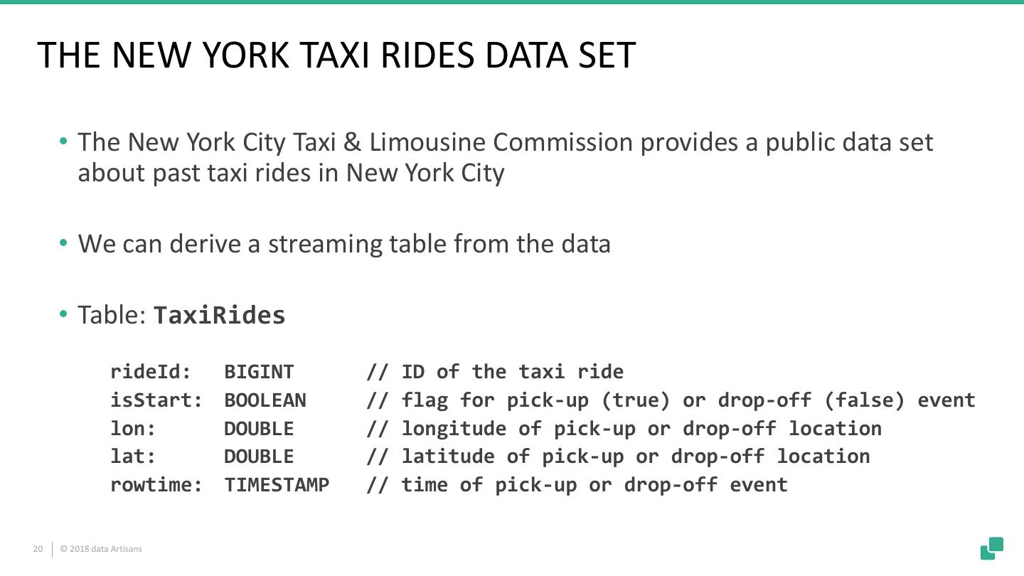 19 .THE NEW YORK TAXI RIDES DATA SET • The New York City Taxi & Limousine Commission provides a public data set about past taxi rides in New York City • We can derive a streaming table from the data • Table: TaxiRides rideId: BIGINT // ID of the taxi ride isStart: BOOLEAN // flag for pick-up (true) or drop-off (false) event lon: DOUBLE // longitude of pick-up or drop-off location lat: DOUBLE // latitude of pick-up or drop-off location rowtime: TIMESTAMP // time of pick-up or drop-off event 20 © 2018 data Artisans
