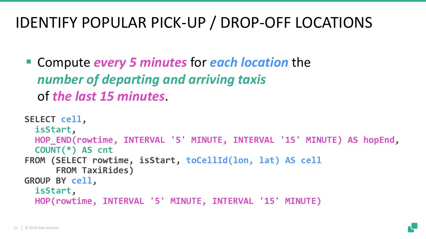 20 .IDENTIFY POPULAR PICK-UP / DROP-OFF LOCATIONS ▪ Compute every 5 minutes for each location the number of departing and arriving taxis of the last 15 minutes. SELECT cell, isStart, HOP_END(rowtime, INTERVAL '5' MINUTE, INTERVAL '15' MINUTE) AS hopEnd, COUNT(*) AS cnt FROM (SELECT rowtime, isStart, toCellId(lon, lat) AS cell FROM TaxiRides) GROUP BY cell, isStart, HOP(rowtime, INTERVAL '5' MINUTE, INTERVAL '15' MINUTE) 21 © 2018 data Artisans