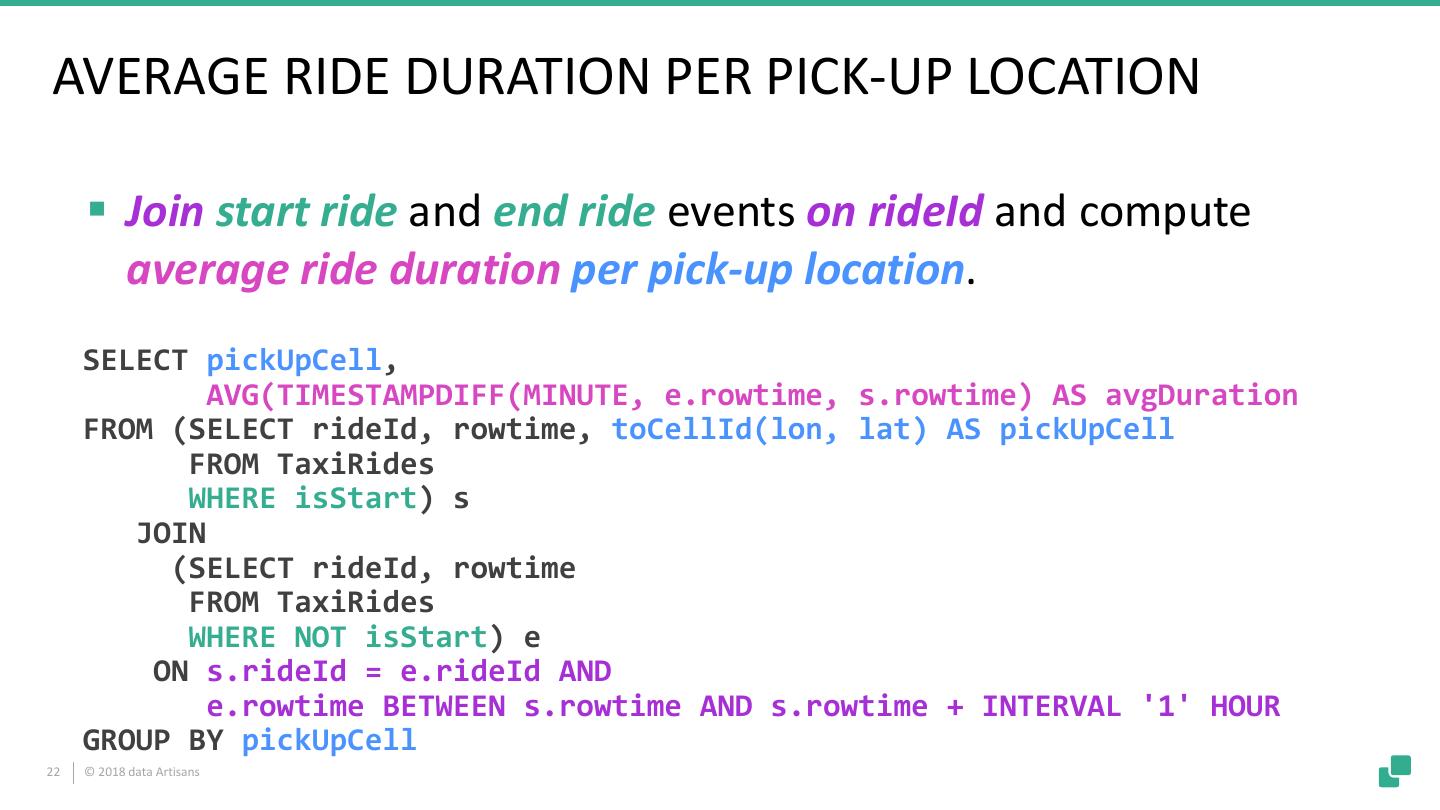 21 .AVERAGE RIDE DURATION PER PICK-UP LOCATION ▪ Join start ride and end ride events on rideId and compute average ride duration per pick-up location. SELECT pickUpCell, AVG(TIMESTAMPDIFF(MINUTE, e.rowtime, s.rowtime) AS avgDuration FROM (SELECT rideId, rowtime, toCellId(lon, lat) AS pickUpCell FROM TaxiRides WHERE isStart) s JOIN (SELECT rideId, rowtime FROM TaxiRides WHERE NOT isStart) e ON s.rideId = e.rideId AND e.rowtime BETWEEN s.rowtime AND s.rowtime + INTERVAL '1' HOUR GROUP BY pickUpCell 22 © 2018 data Artisans