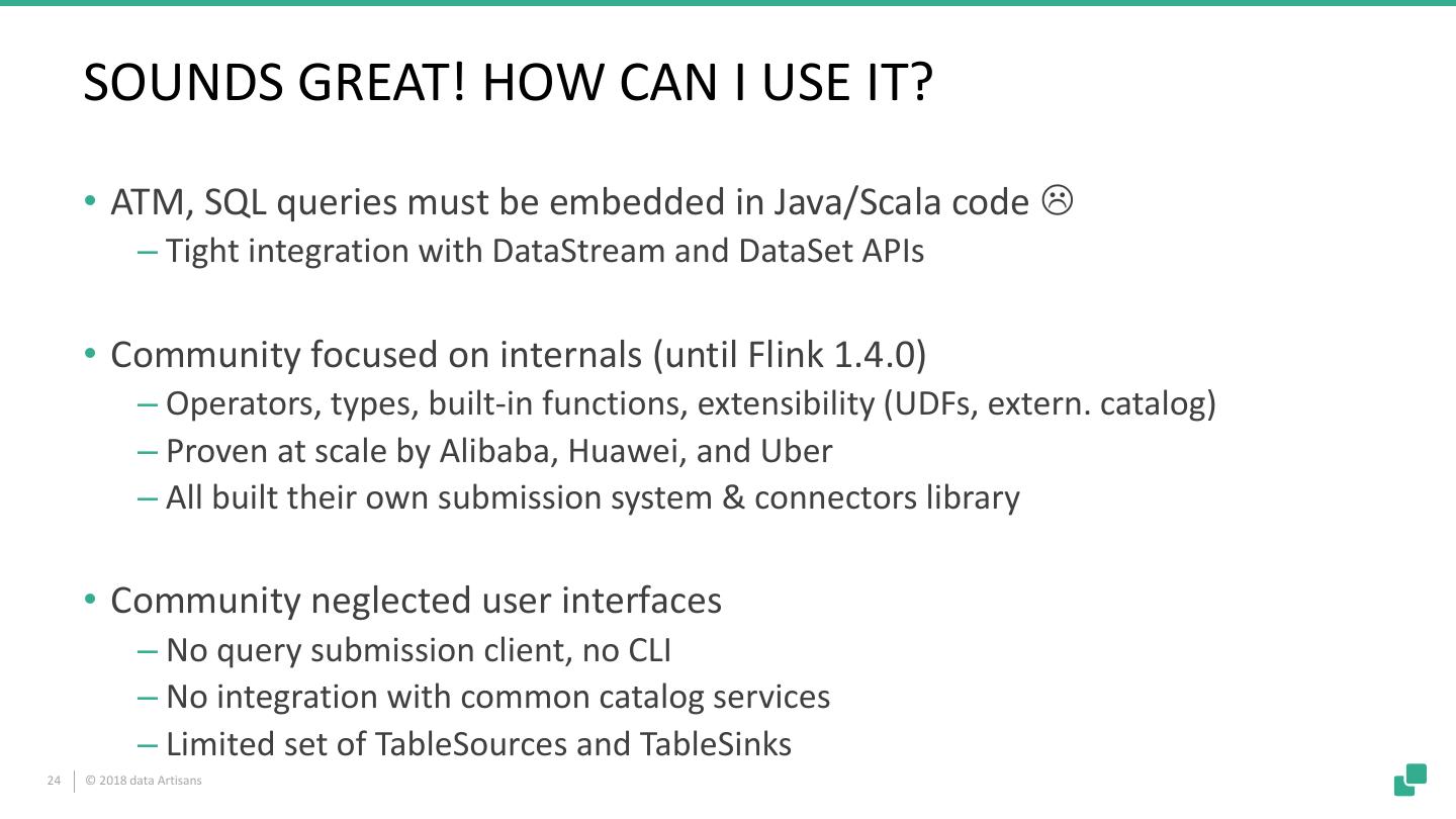 23 . SOUNDS GREAT! HOW CAN I USE IT? • ATM, SQL queries must be embedded in Java/Scala code ‒ Tight integration with DataStream and DataSet APIs • Community focused on internals (until Flink 1.4.0) ‒ Operators, types, built-in functions, extensibility (UDFs, extern. catalog) ‒ Proven at scale by Alibaba, Huawei, and Uber ‒ All built their own submission system & connectors library • Community neglected user interfaces ‒ No query submission client, no CLI ‒ No integration with common catalog services ‒ Limited set of TableSources and TableSinks 24 © 2018 data Artisans