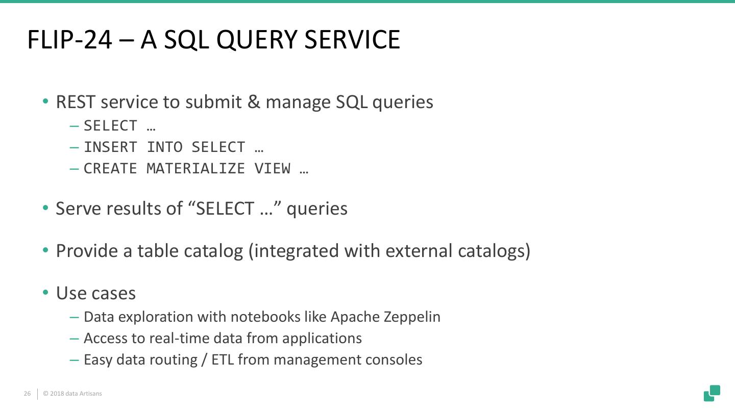 25 .FLIP-24 – A SQL QUERY SERVICE • REST service to submit & manage SQL queries ‒ SELECT … ‒ INSERT INTO SELECT … ‒ CREATE MATERIALIZE VIEW … • Serve results of “SELECT …” queries • Provide a table catalog (integrated with external catalogs) • Use cases ‒ Data exploration with notebooks like Apache Zeppelin ‒ Access to real-time data from applications ‒ Easy data routing / ETL from management consoles 26 © 2018 data Artisans
