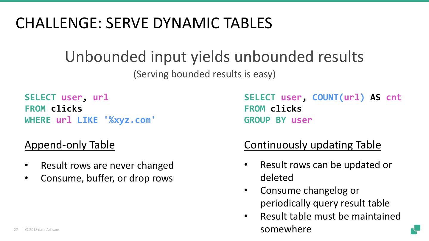 26 .CHALLENGE: SERVE DYNAMIC TABLES Unbounded input yields unbounded results (Serving bounded results is easy) SELECT user, url SELECT user, COUNT(url) AS cnt FROM clicks FROM clicks WHERE url LIKE '%xyz.com' GROUP BY user Append-only Table Continuously updating Table • Result rows are never changed • Result rows can be updated or • Consume, buffer, or drop rows deleted • Consume changelog or periodically query result table • Result table must be maintained 27 © 2018 data Artisans somewhere
