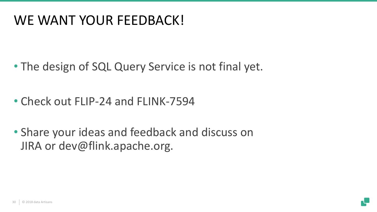 29 .WE WANT YOUR FEEDBACK! • The design of SQL Query Service is not final yet. • Check out FLIP-24 and FLINK-7594 • Share your ideas and feedback and discuss on JIRA or dev@flink.apache.org. 30 © 2018 data Artisans