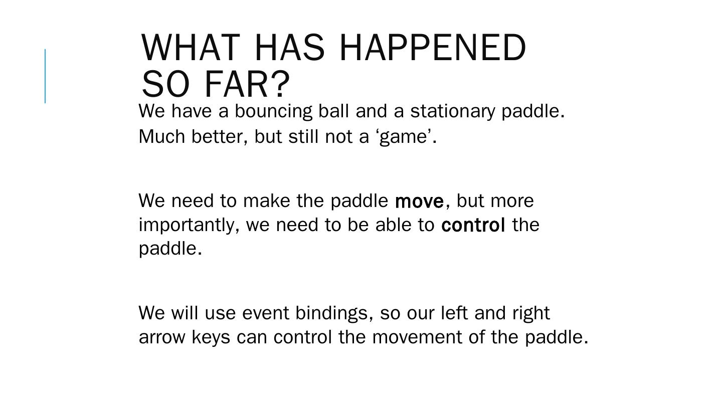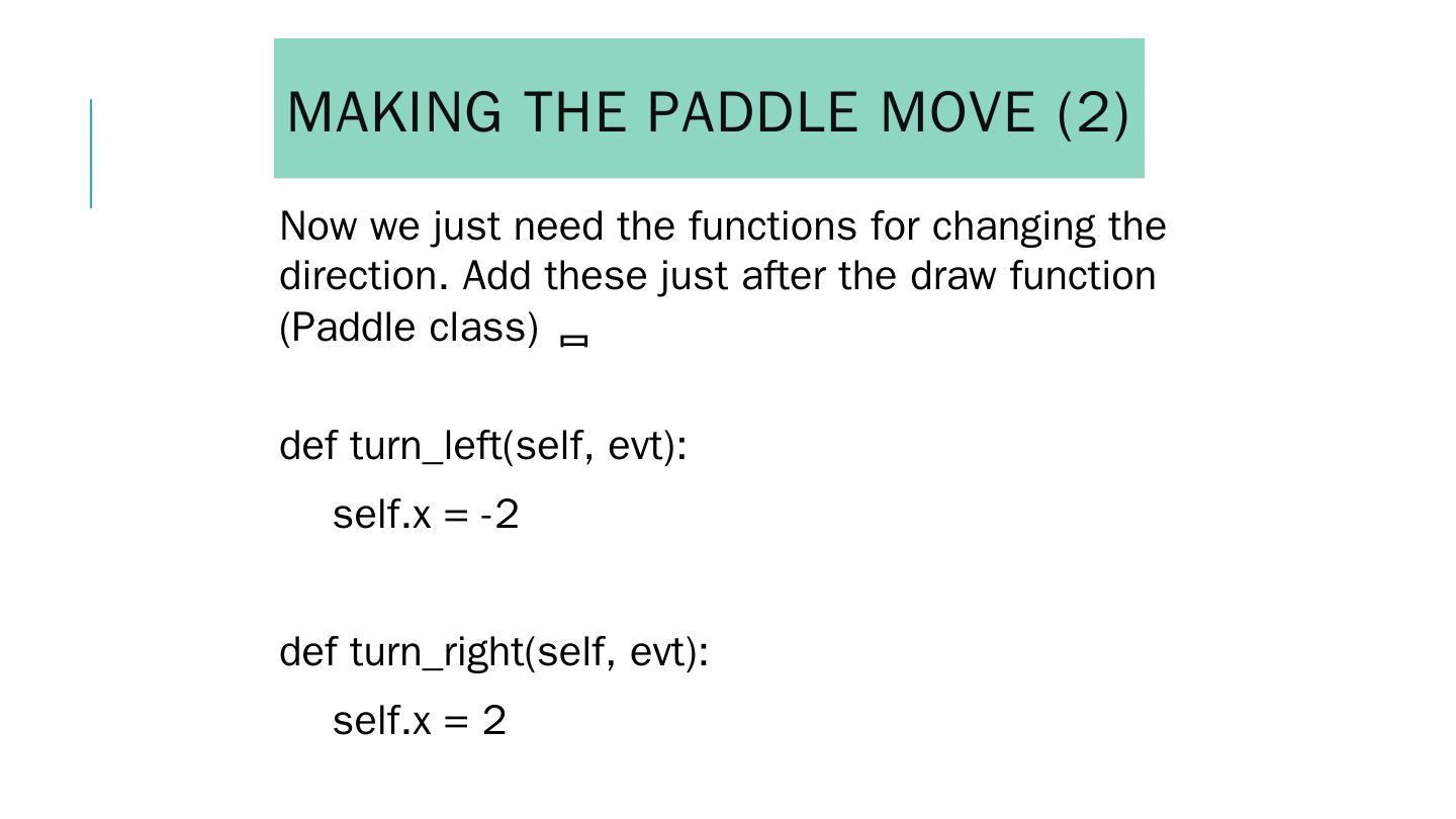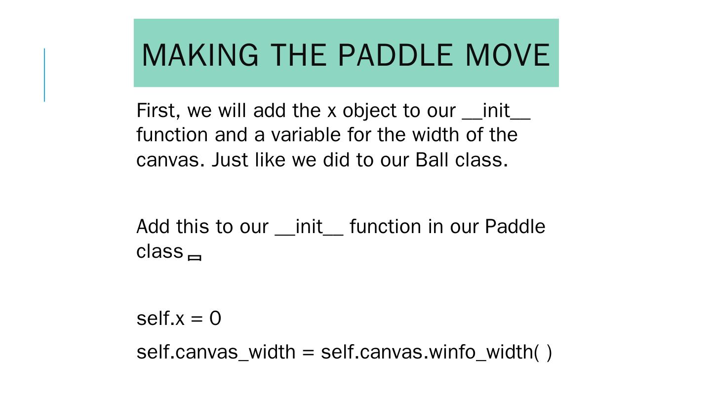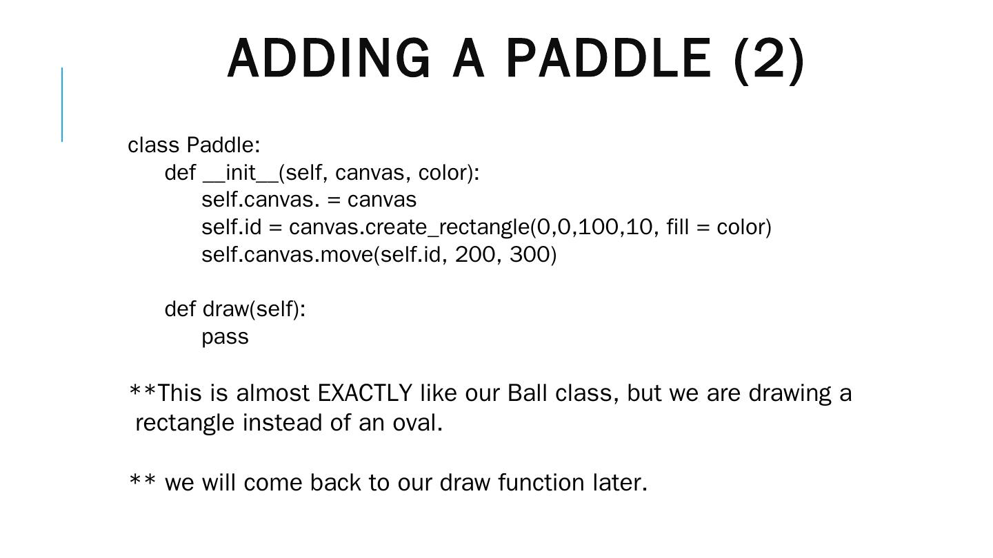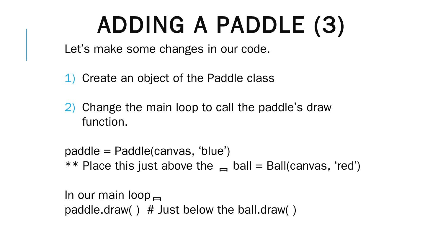 Adding a paddle (1). We now have a code, which will run forever and just have a ball bouncing around the screen until we shut down the program. To make it ...