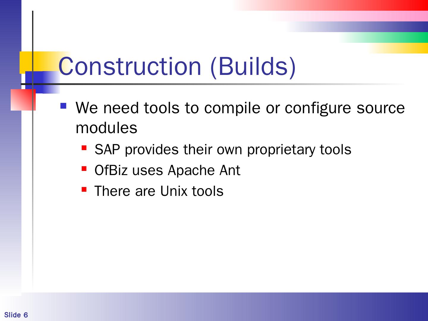SAP provides their own proprietary tools; OfBiz uses Apache Ant; There are Unix tools. Slide 7. Ant (Introduction). It's designed to build and distribute programs ...