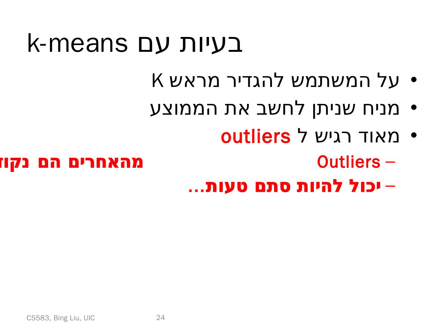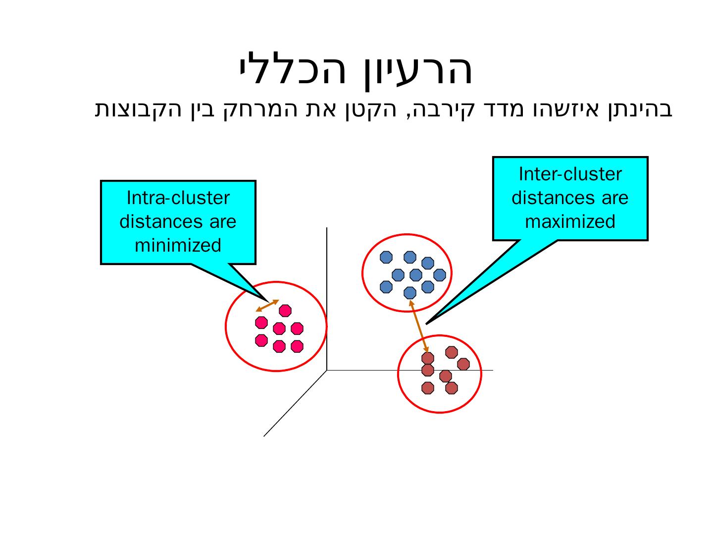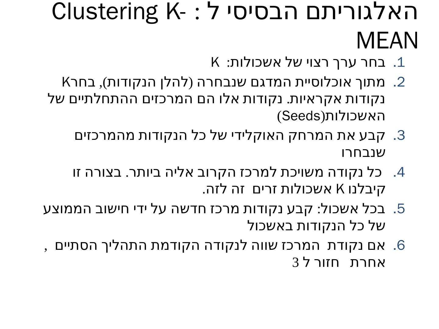 Intra-cluster distances are minimized. האלגוריתם הבסיסי ל : Clustering K-MEAN. בחר ערך רצוי של אשכולות: K; מתוך אוכלוסיית המדגם שנבחרה (להלן הנקודות), בחרK נקודות ...