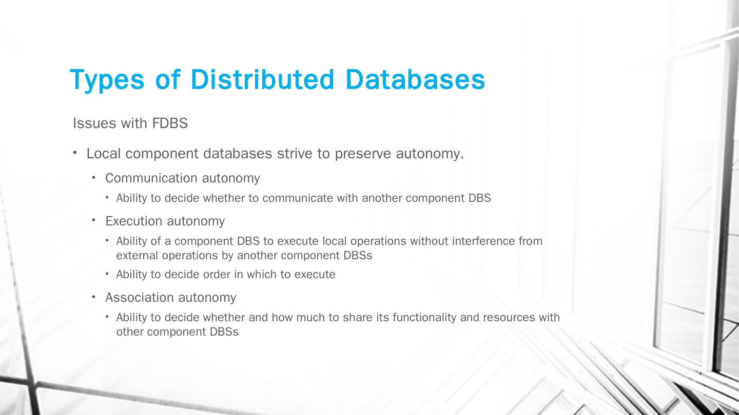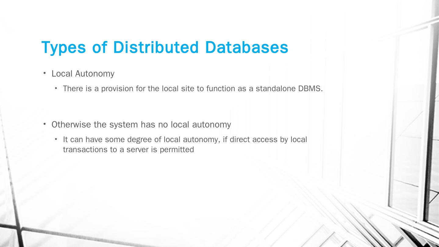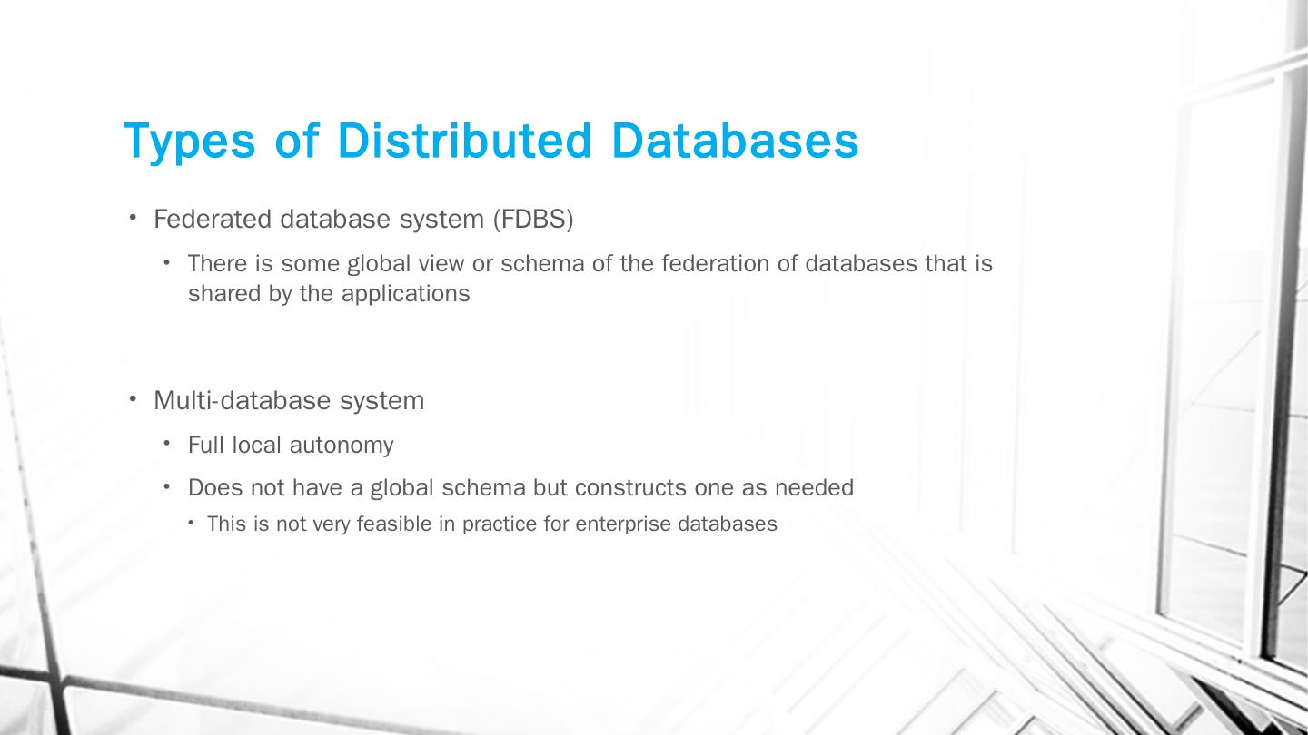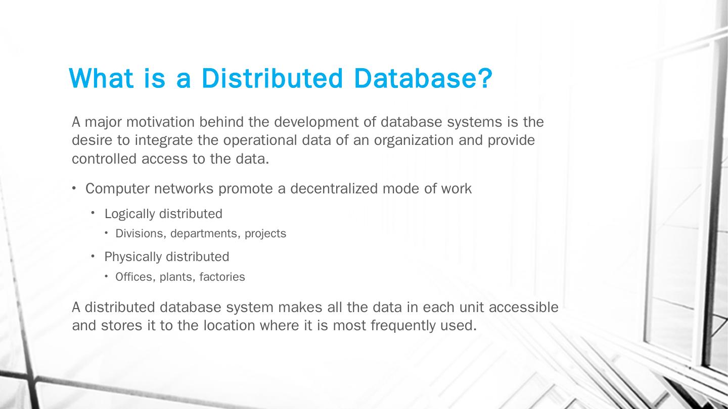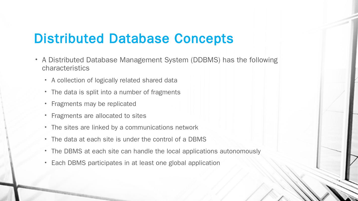 Distributed database management system (DDBMS) – A software system that manages a distributed database while making the distribution transparent to the ...