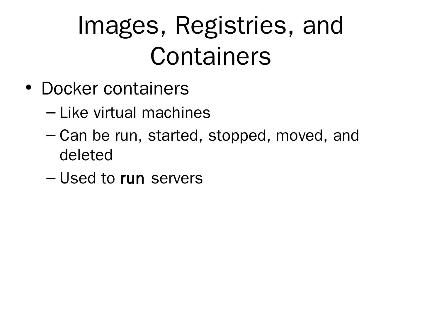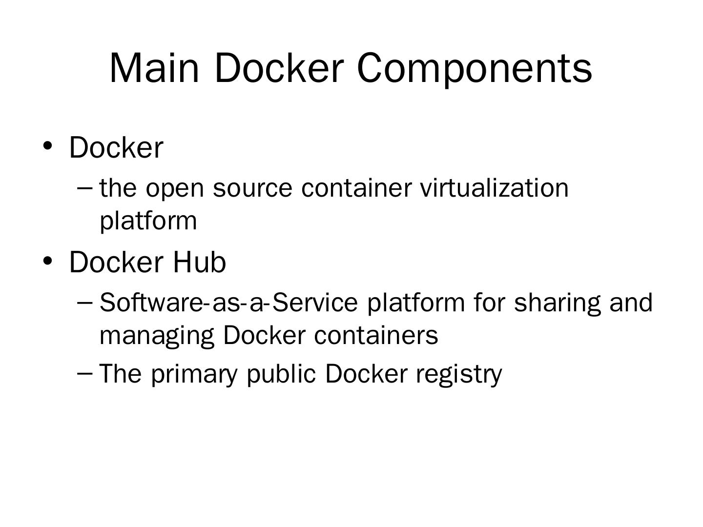 Docker. the open source container virtualization platform. Docker Hub. Software-as-a-Service platform for sharing and managing Docker containers; The primary ...