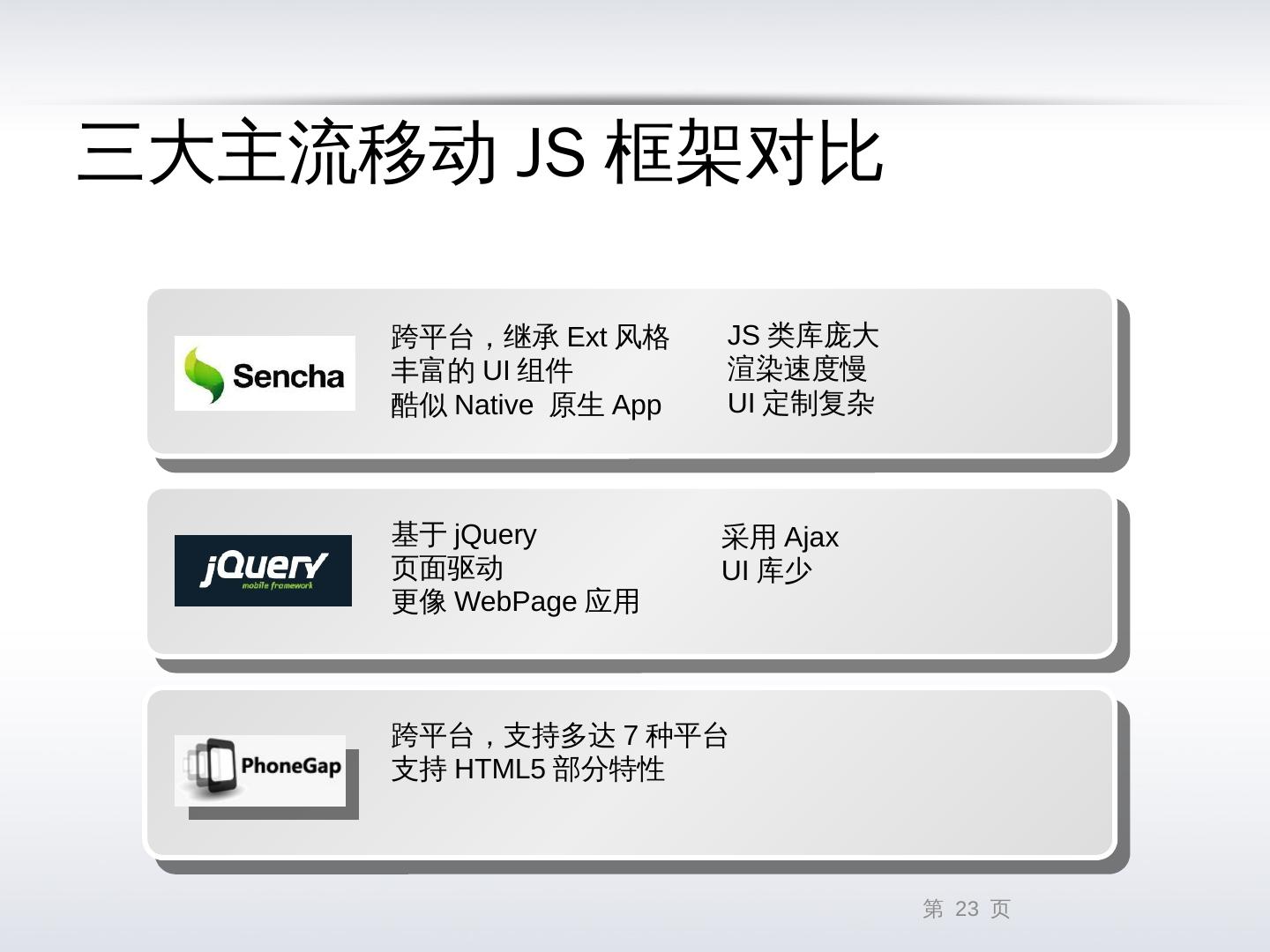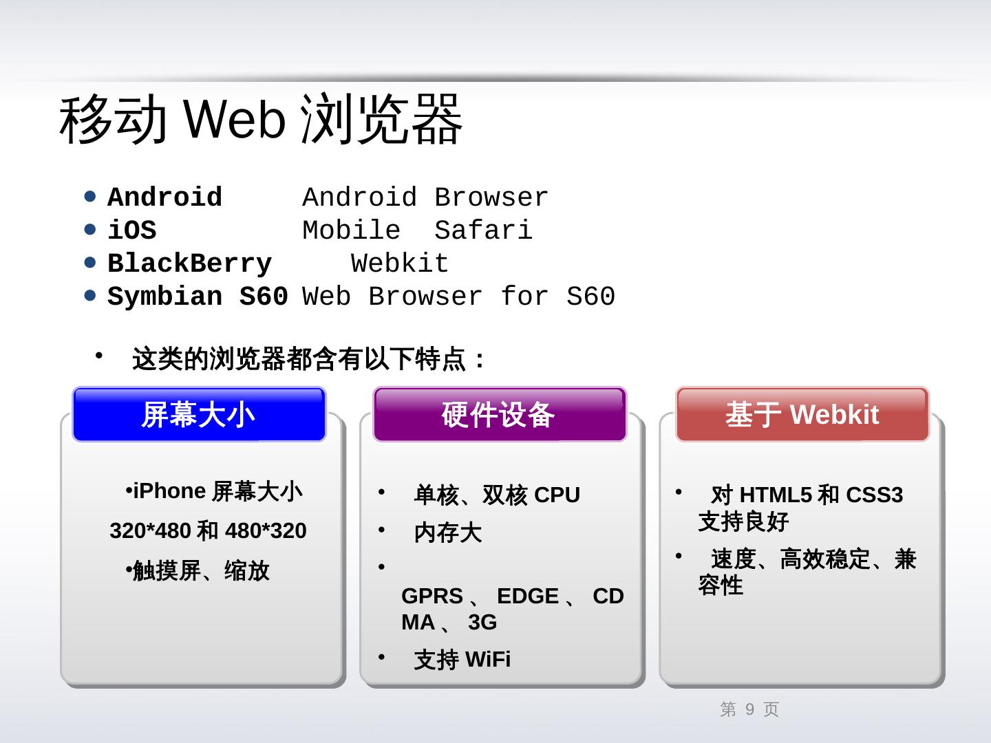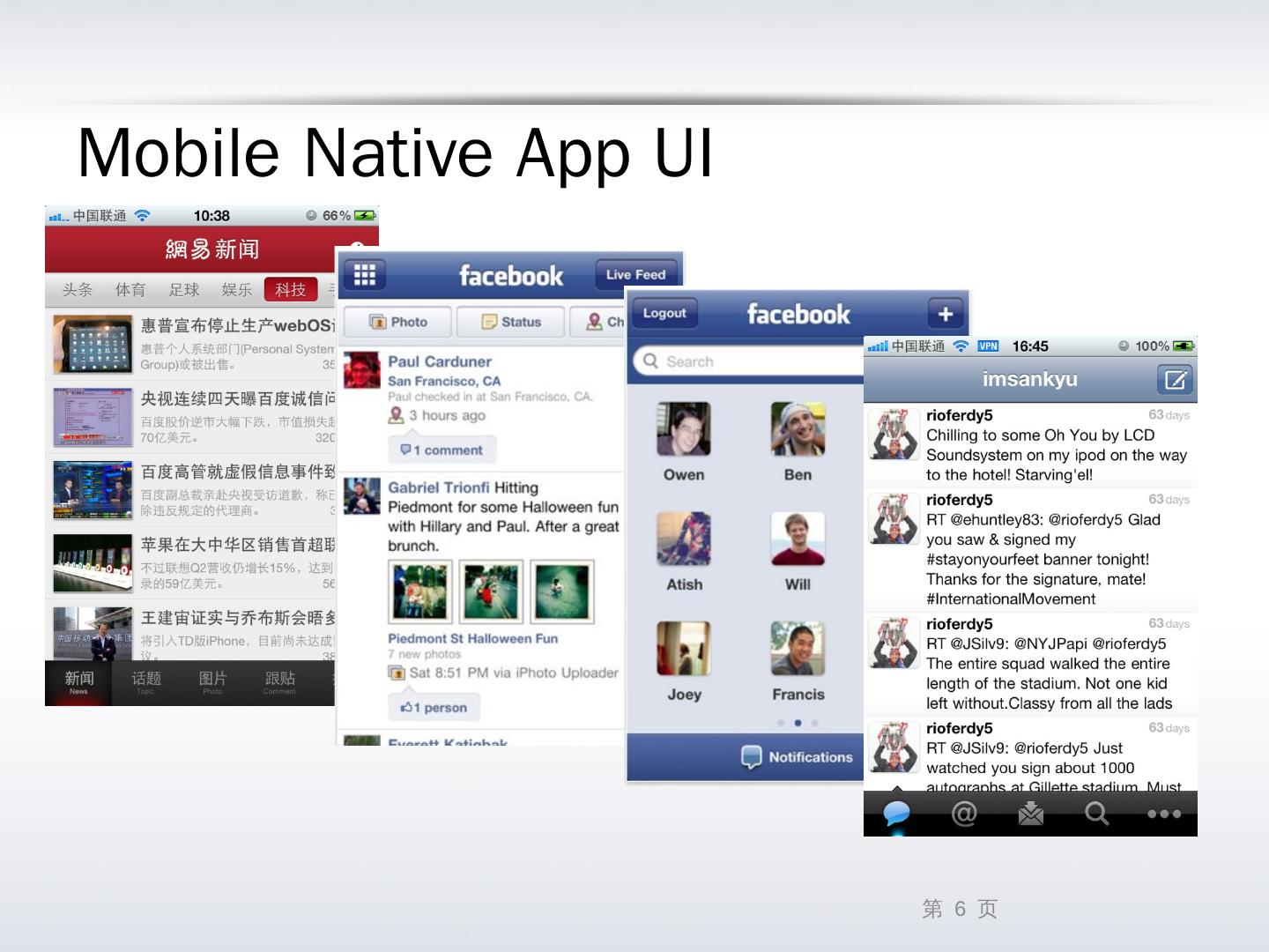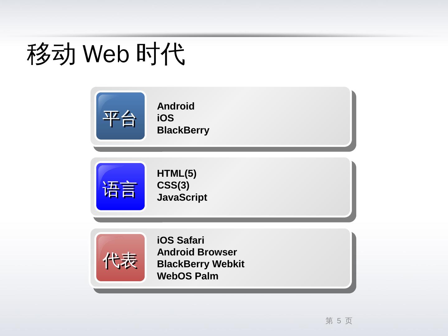 WAP浏览器. UC浏览器. Opera Mini. 移动Web时代. 第 4 页. 平台. Android. iOS ... 不同平台间的移植麻烦;; 维护成本高、调试困难;; 需要第三方审核。 第 7 页.