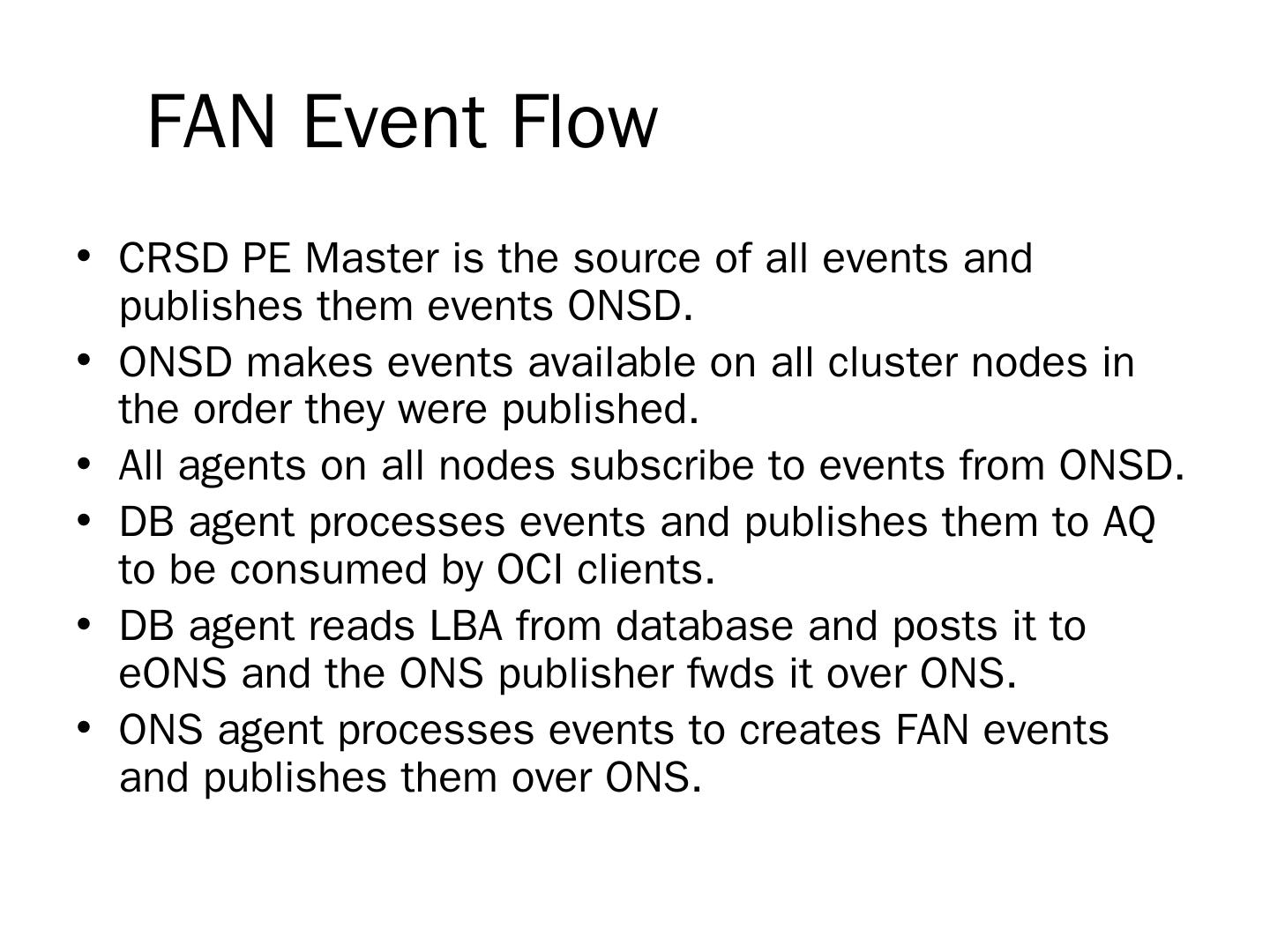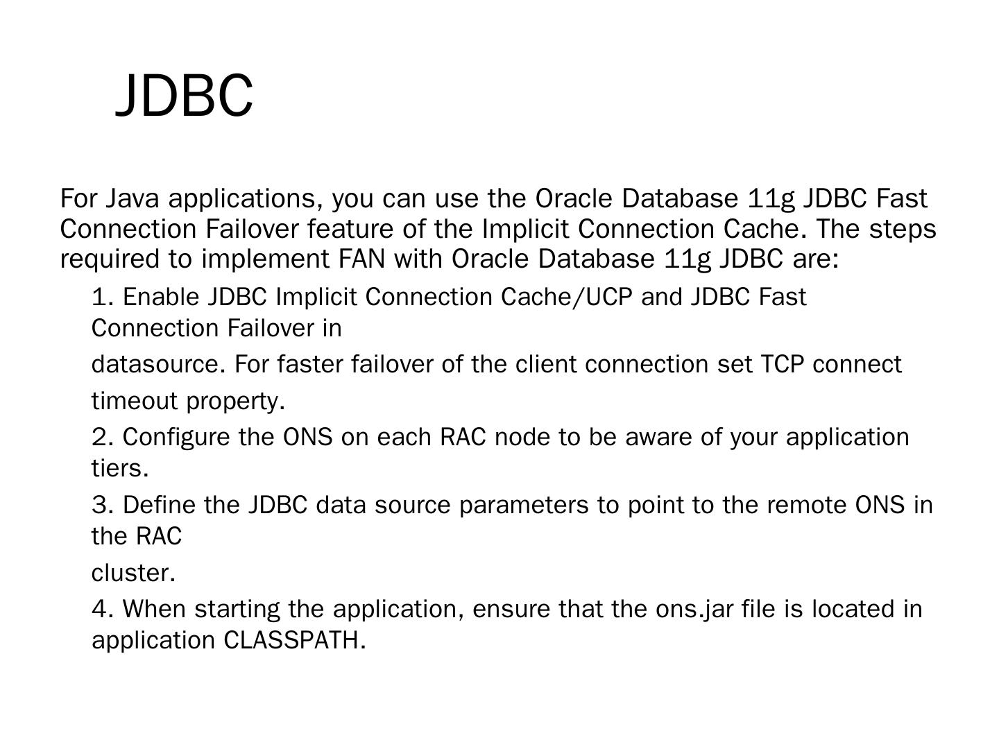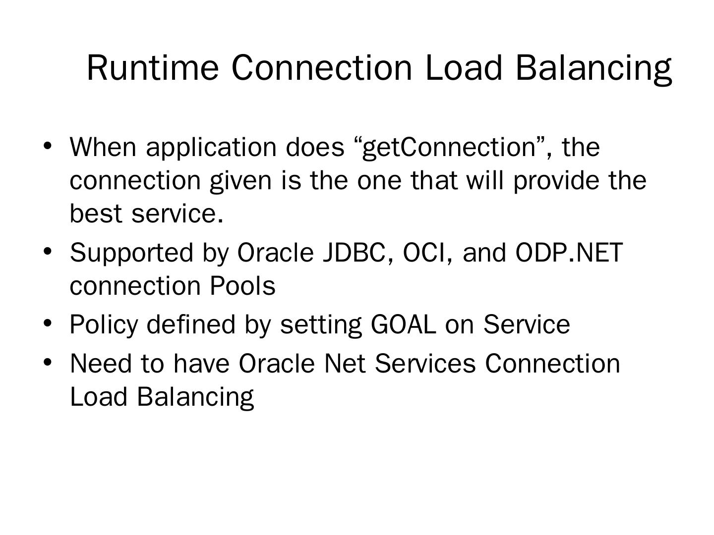 HA Events: JDBC Implicit Connection Cache, OCI, ODP.NET Connection Pools, Listener, Server Side Callouts, CMAN. Load Balancing Advisory Events: JDBC ...