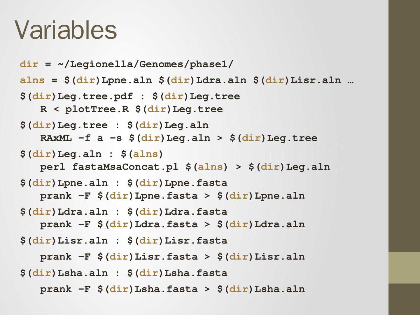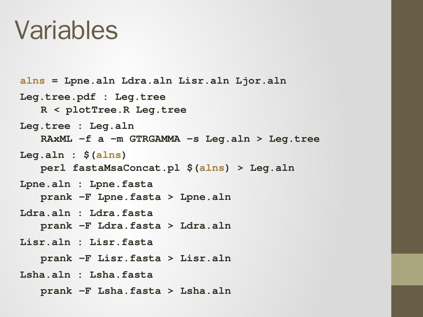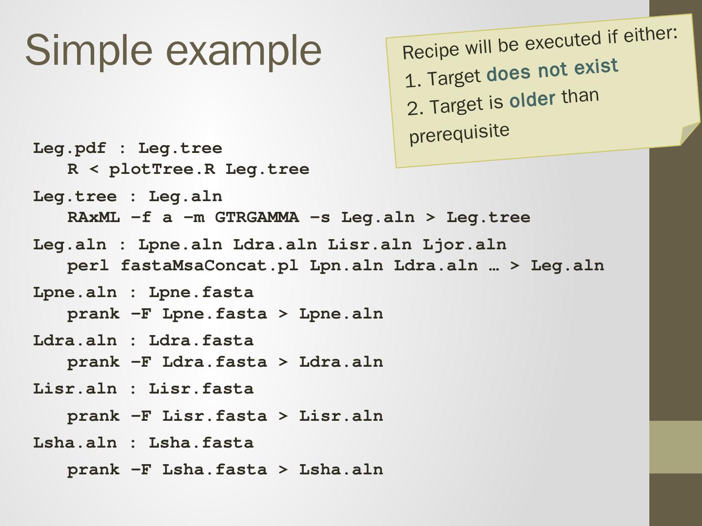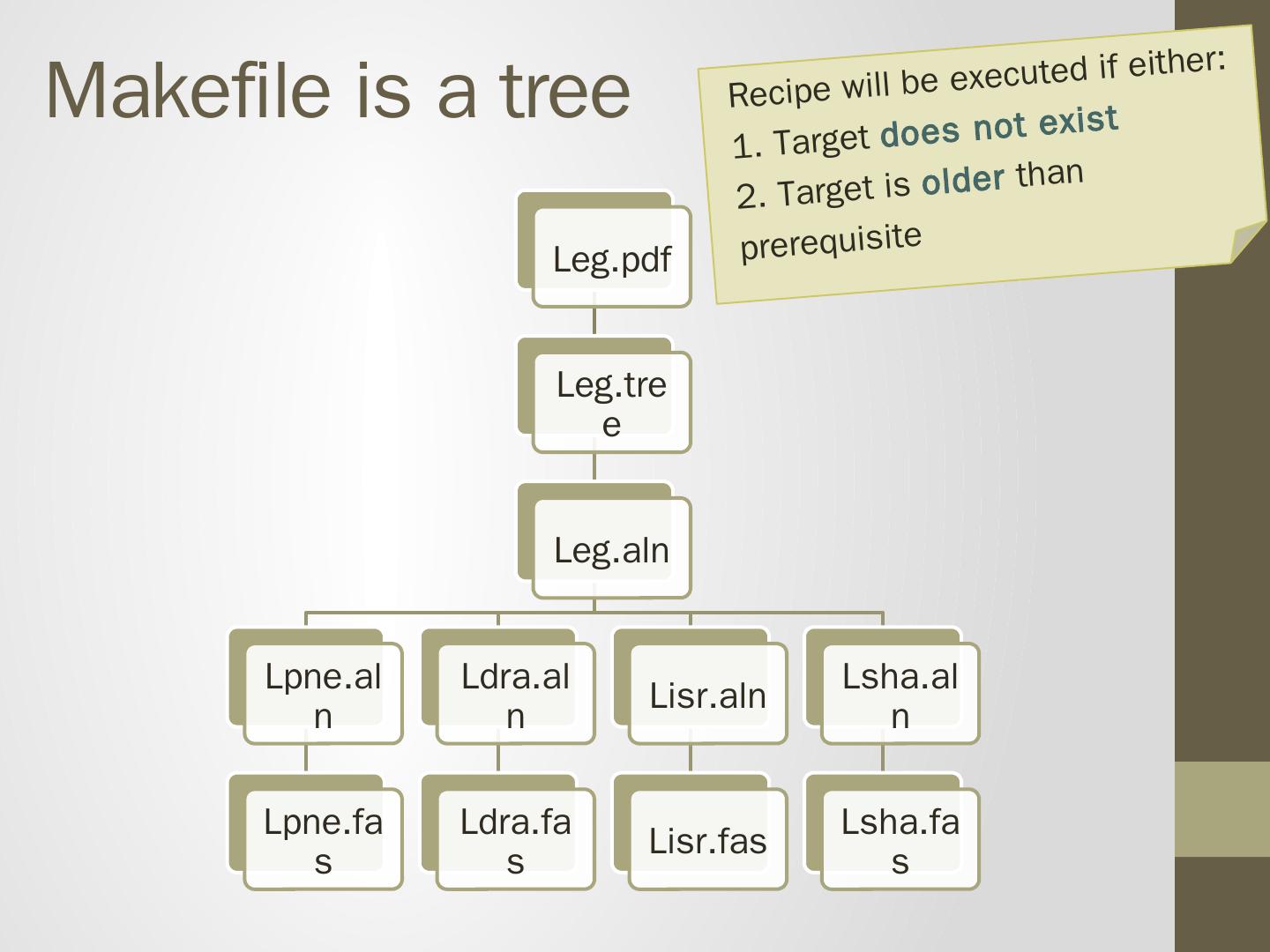 prank -F Lsha.fasta > Lsha.aln. Recipe will be executed if either: 1. Target does not exist 2. Target is older than prerequisite. Makefile is a tree. Leg.pdf. Leg.tree.