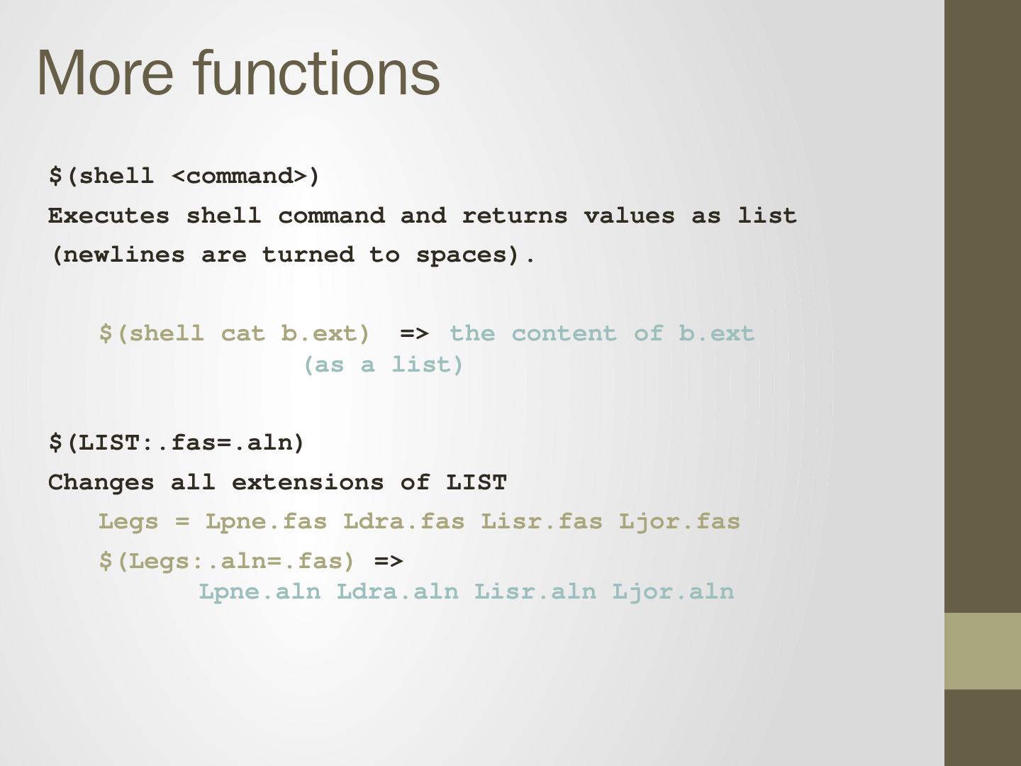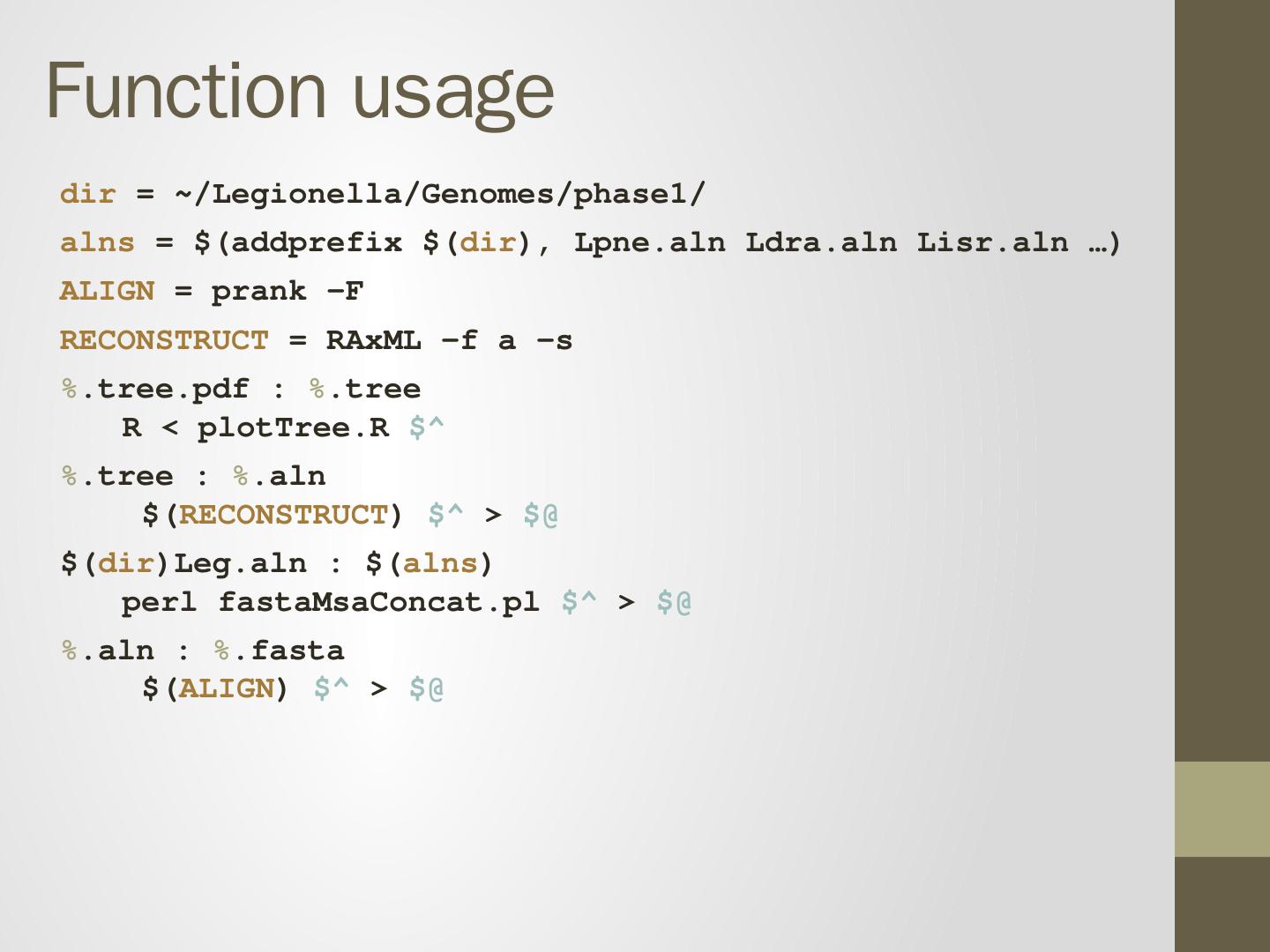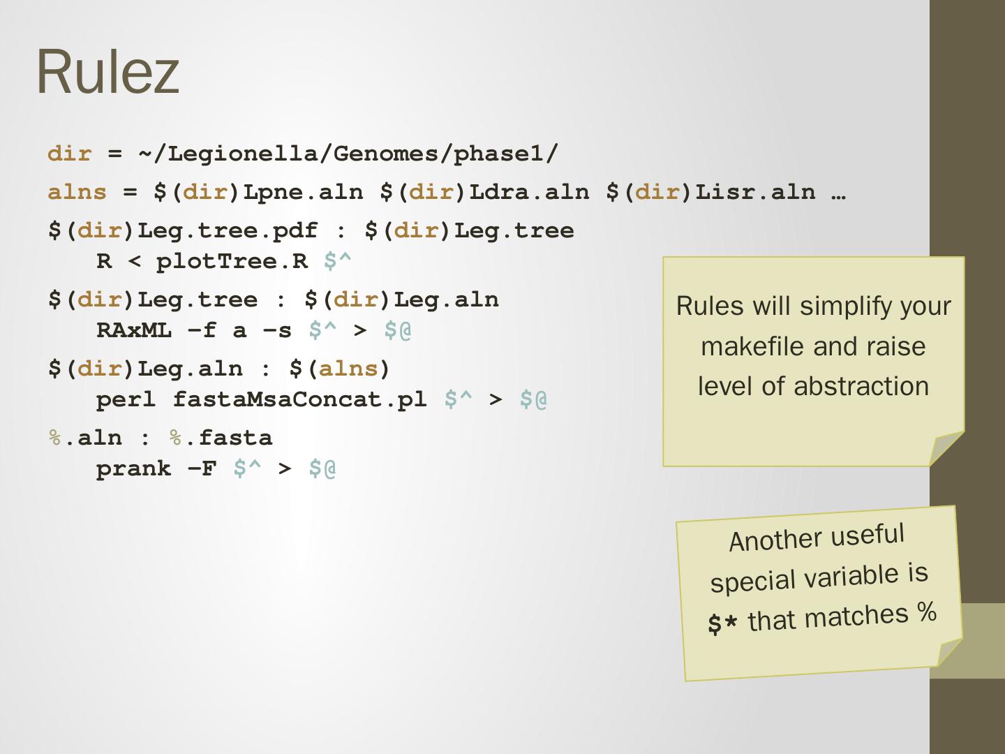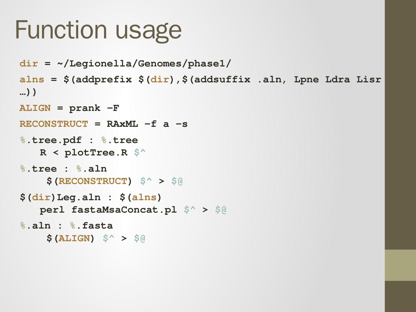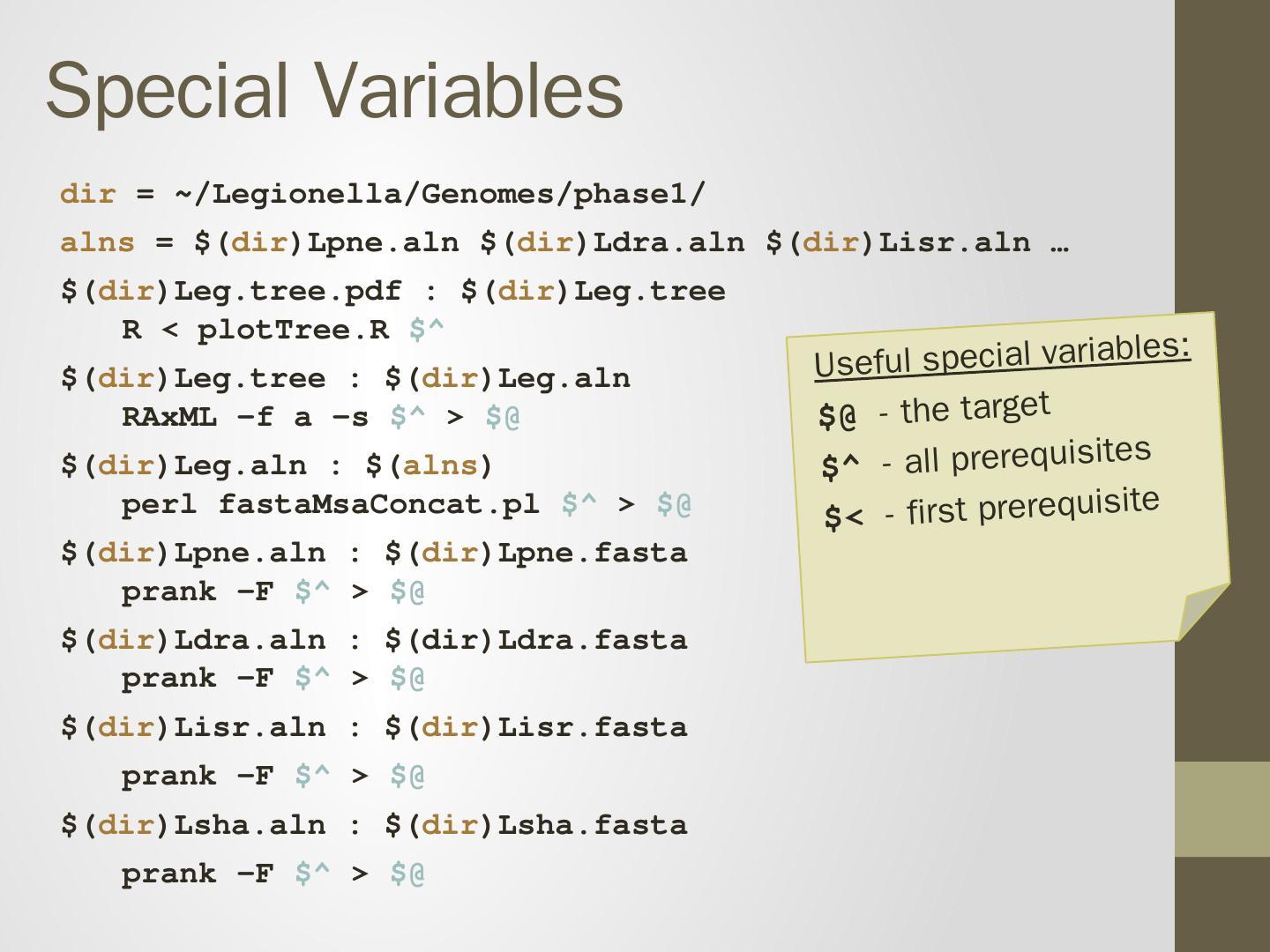 prank -F Lsha.fasta > Lsha.aln. Recipe will be executed if either: 1. Target does not exist 2. Target is older than prerequisite. Makefile is a tree. Leg.pdf. Leg.tree.