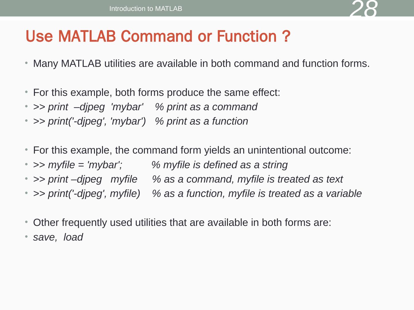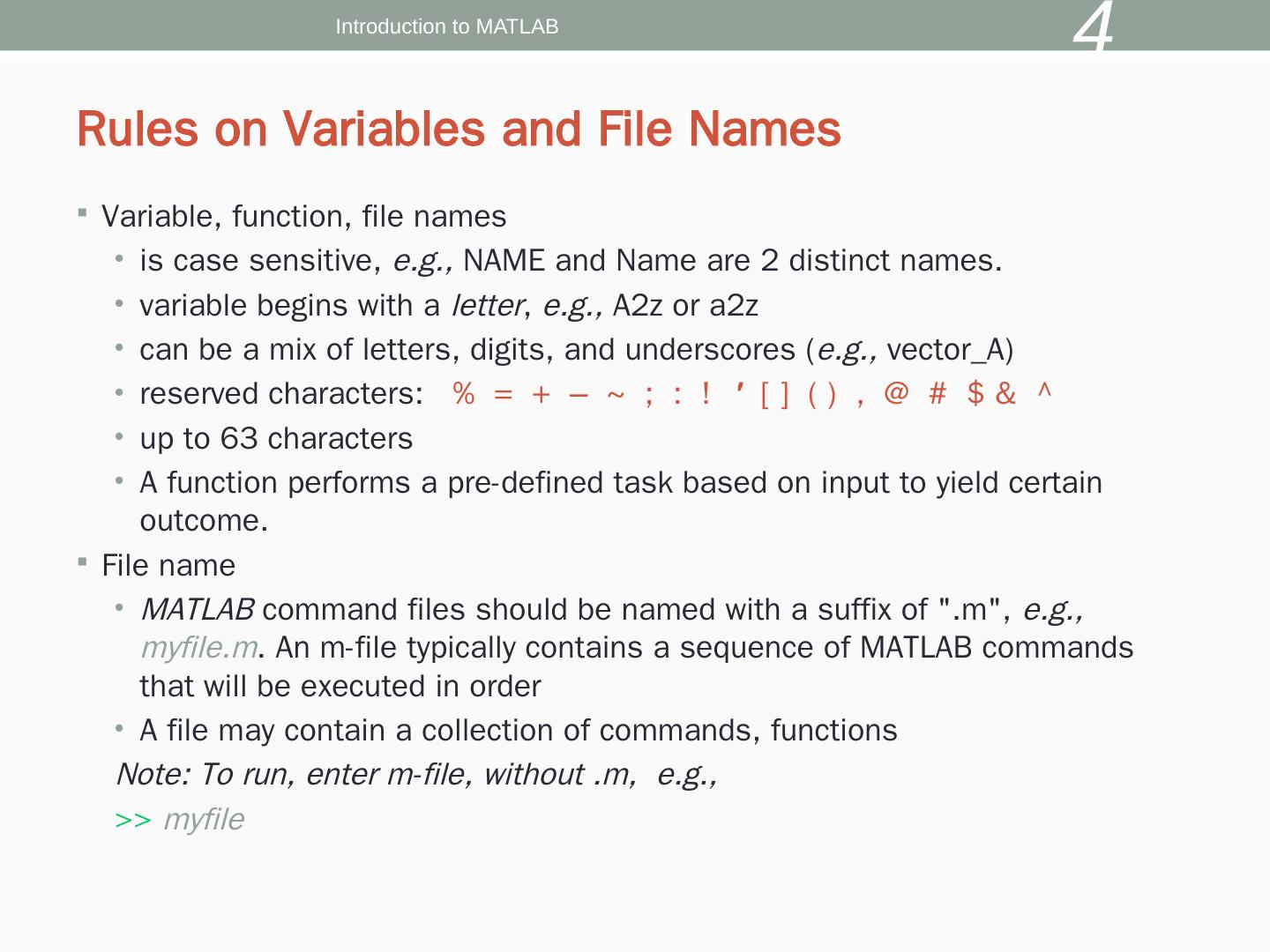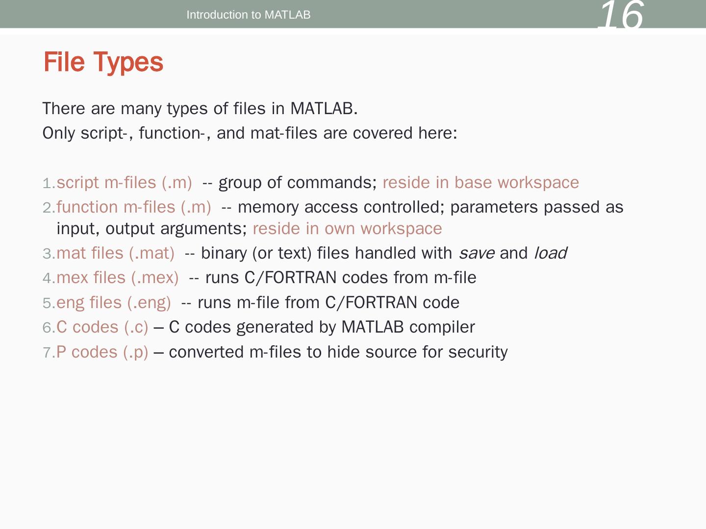 MATLAB command files should be named with a suffix of ".m", e.g., myfile.m. An m-file typically contains a sequence of MATLAB commands that will be executed ...