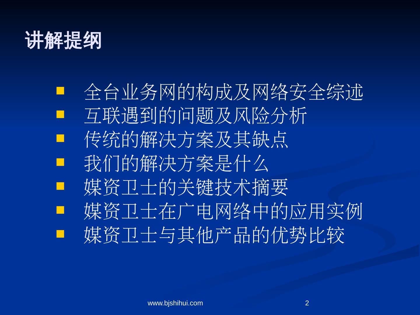 2 .讲解提纲 全台业务网的构成及网络安全综述 互联遇到的问题及风险分析 传统的解决方案及其缺点 我们的解决方案是什么 媒资卫士的关键技术摘要 媒资卫士在广电网络中的应用实例 媒资卫士与其他产品的优势比较 www.bjshihui.com 2