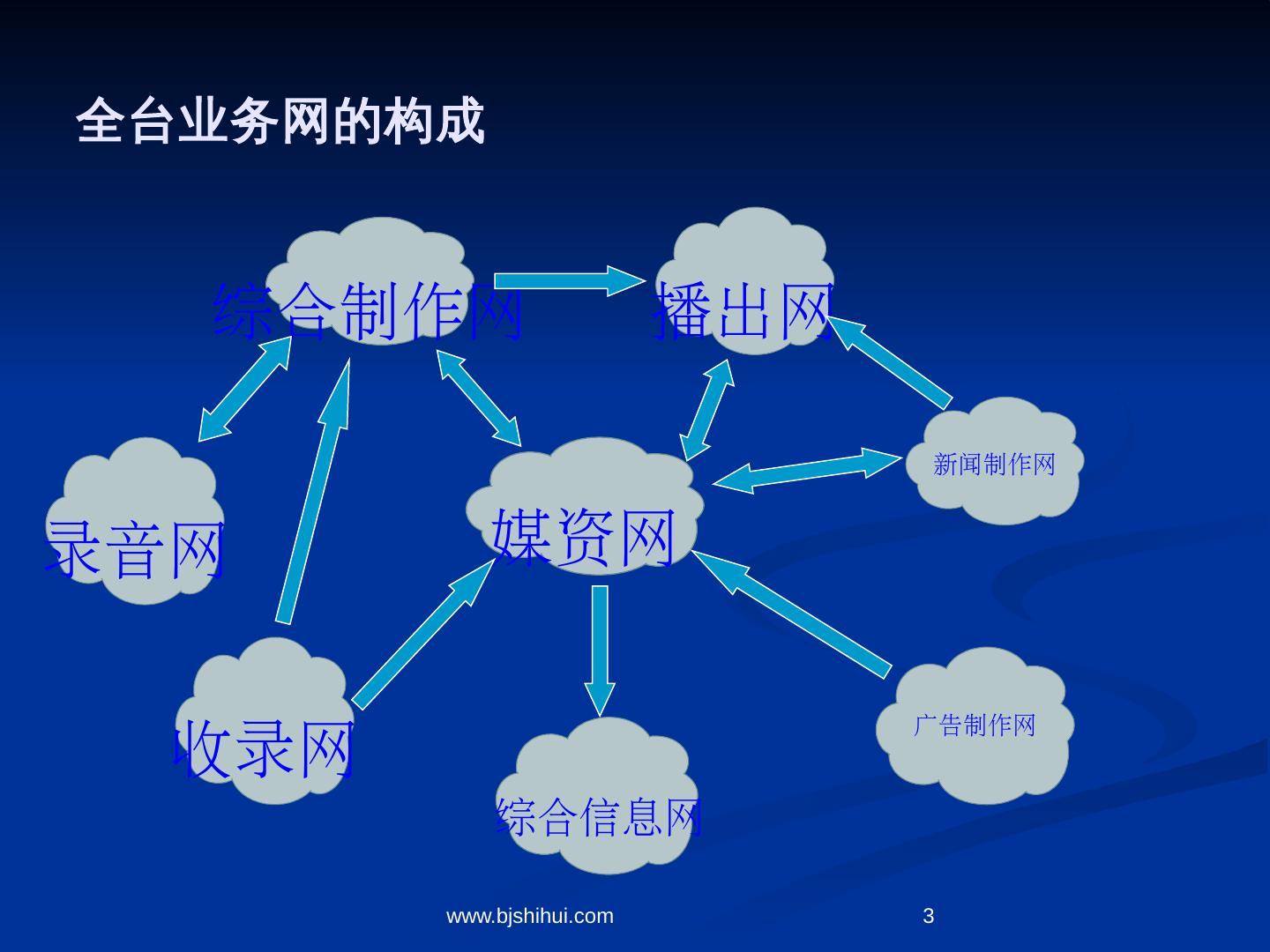 3 .全台业务网的构成 综合制作 网 媒资网 综合信息网 收录网 新闻制作网 广告制作网 录音网 播出网 www.bjshihui.com 3
