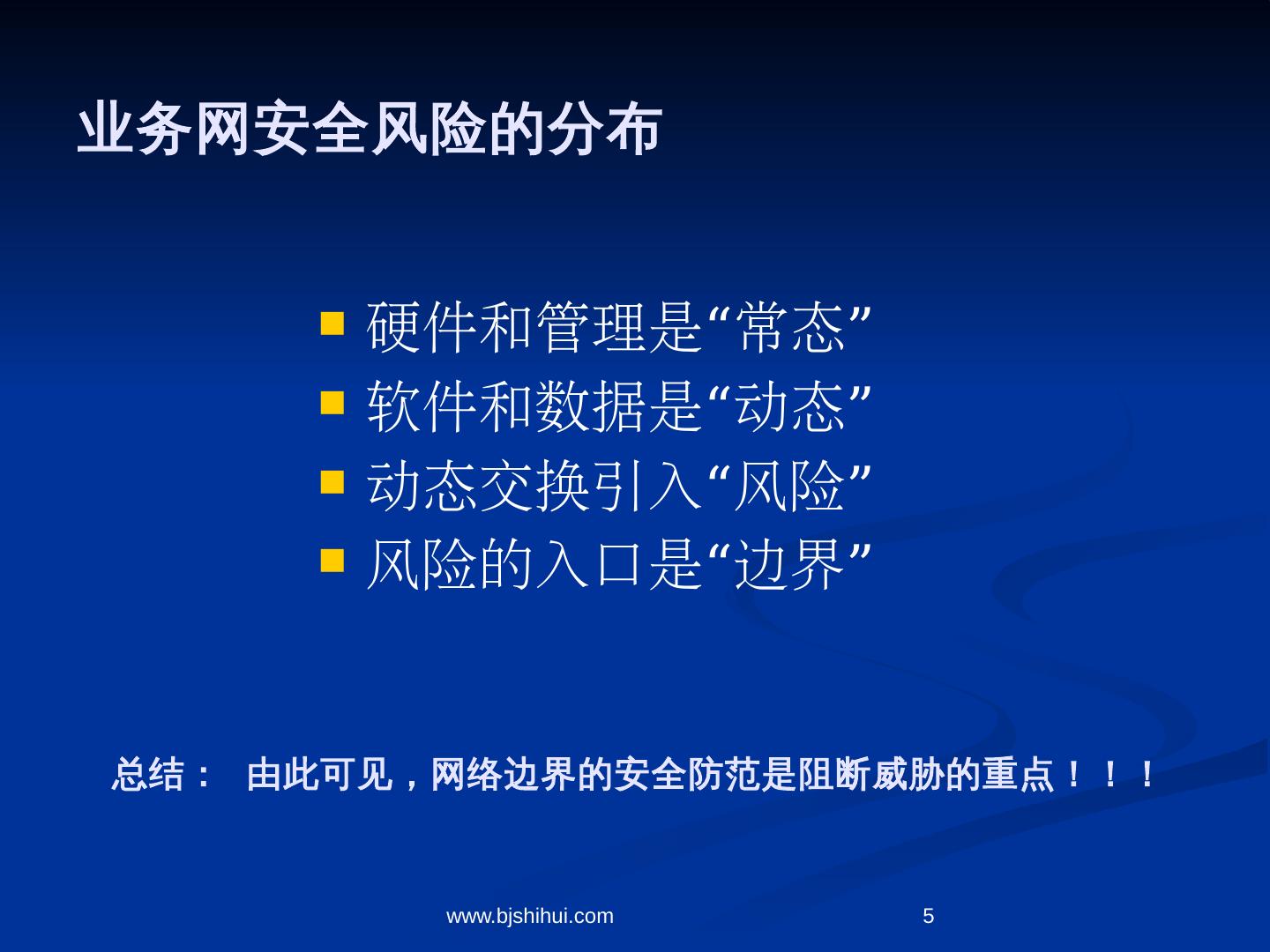 5 .业务网安全风险的分布 硬件和管理是“常态” 软件 和数据是 “动态” 动态交换引入 “风险” 风险的入口是“边界” 5 www.bjshihui.com 总结: 由此可见,网络边界的安全防范是阻断威胁的重点!!!
