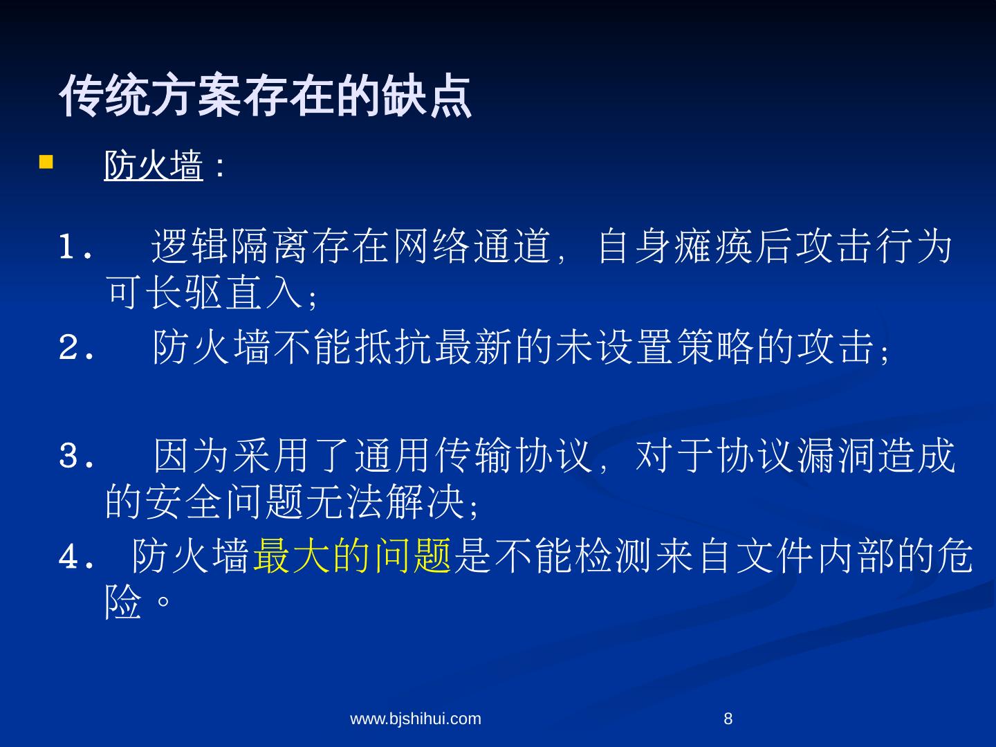 7 .传统的解决方案是什么 B 网络 A 网络 防火墙 网络杀毒 网络杀毒 网络间通过防火墙隔离 网络内部安装杀毒软件 www.bjshihui.com 7