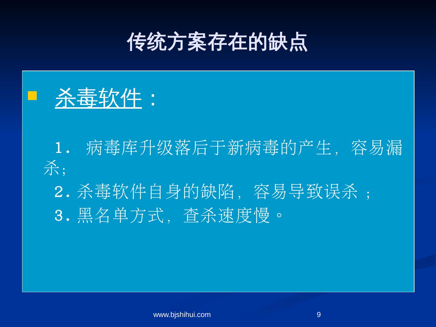 9 .传统方案存在的缺点 9 www.bjshihui.com 杀毒软件 : 1. 病毒库升级落后于新病毒的产生,容易漏杀; 2. 杀毒软件自身的缺陷,容易导致误杀 ; 3. 黑名单方式,查杀速度慢。