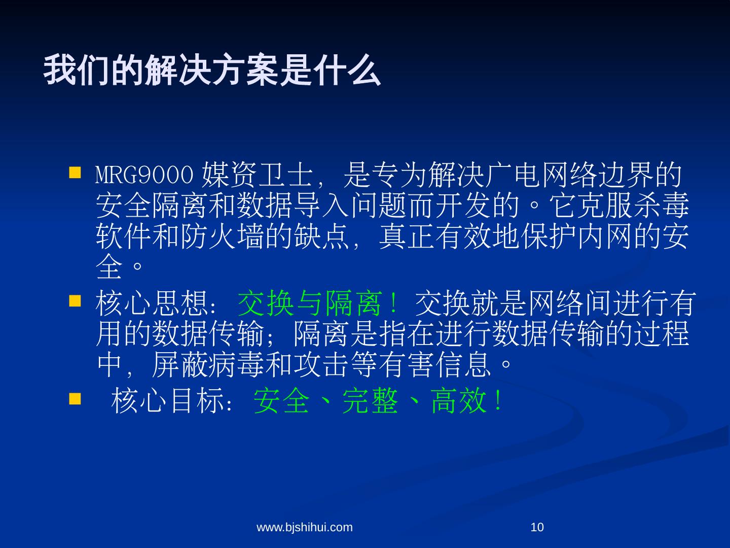 10 .我们的解决方案是什么 MRG9000 媒资卫士,是专为解决广电网络边界的安全隔离和数据导入问题而开发的。它克服杀毒软件和防火墙的缺点,真正有效地保护内网的安全。 核心思想: 交换与隔离! 交换就是网络间进行有用的数据传输;隔离是指在进行数据传输的过程中,屏蔽病毒和攻击等有害信息。 核心目标: 安全、完整、高效! www.bjshihui.com 10