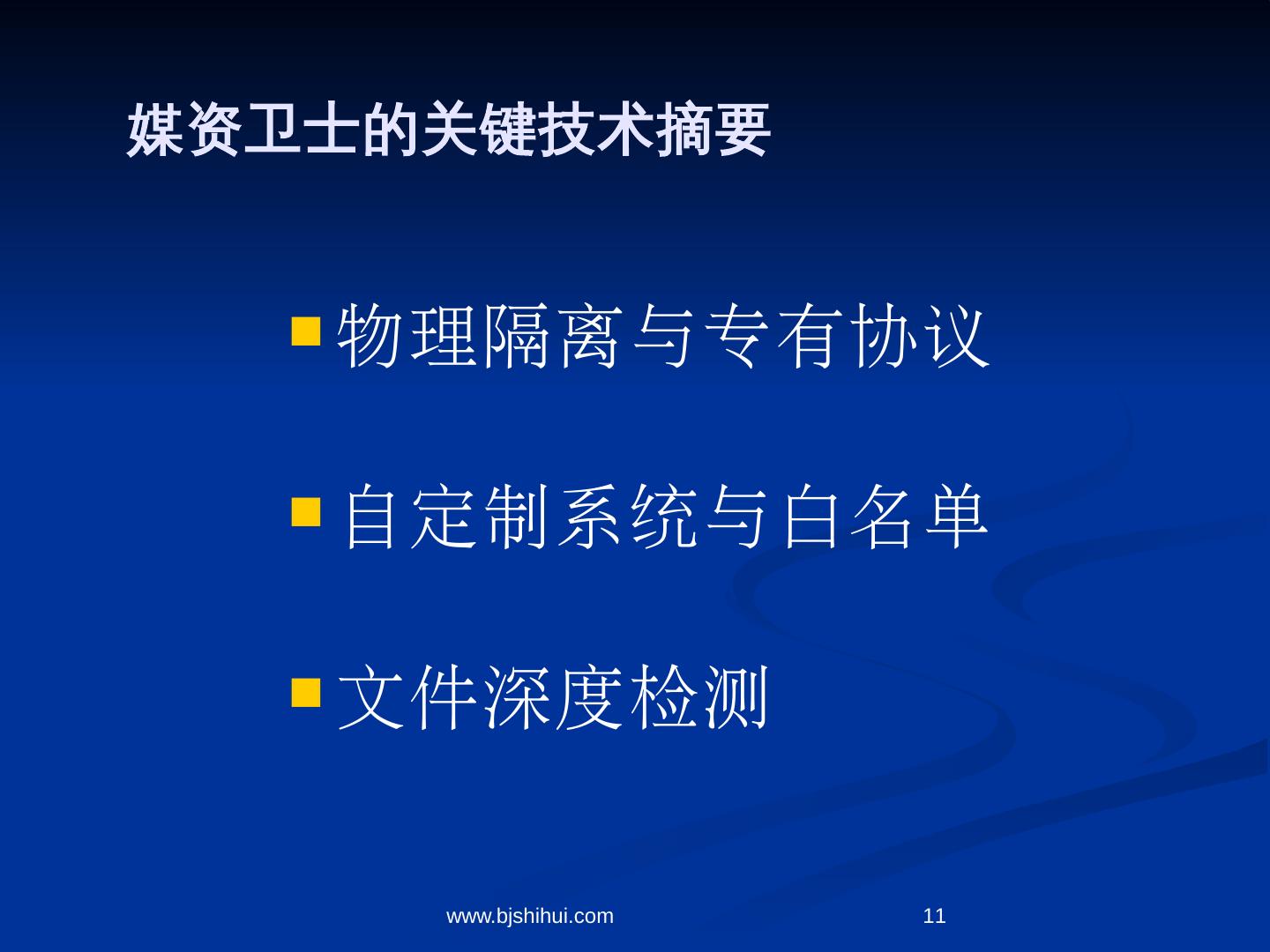 11 .媒资卫士的关键技术摘要 物理隔离与专有协议 自定制系统与白名单 文件深度检测 www.bjshihui.com 11