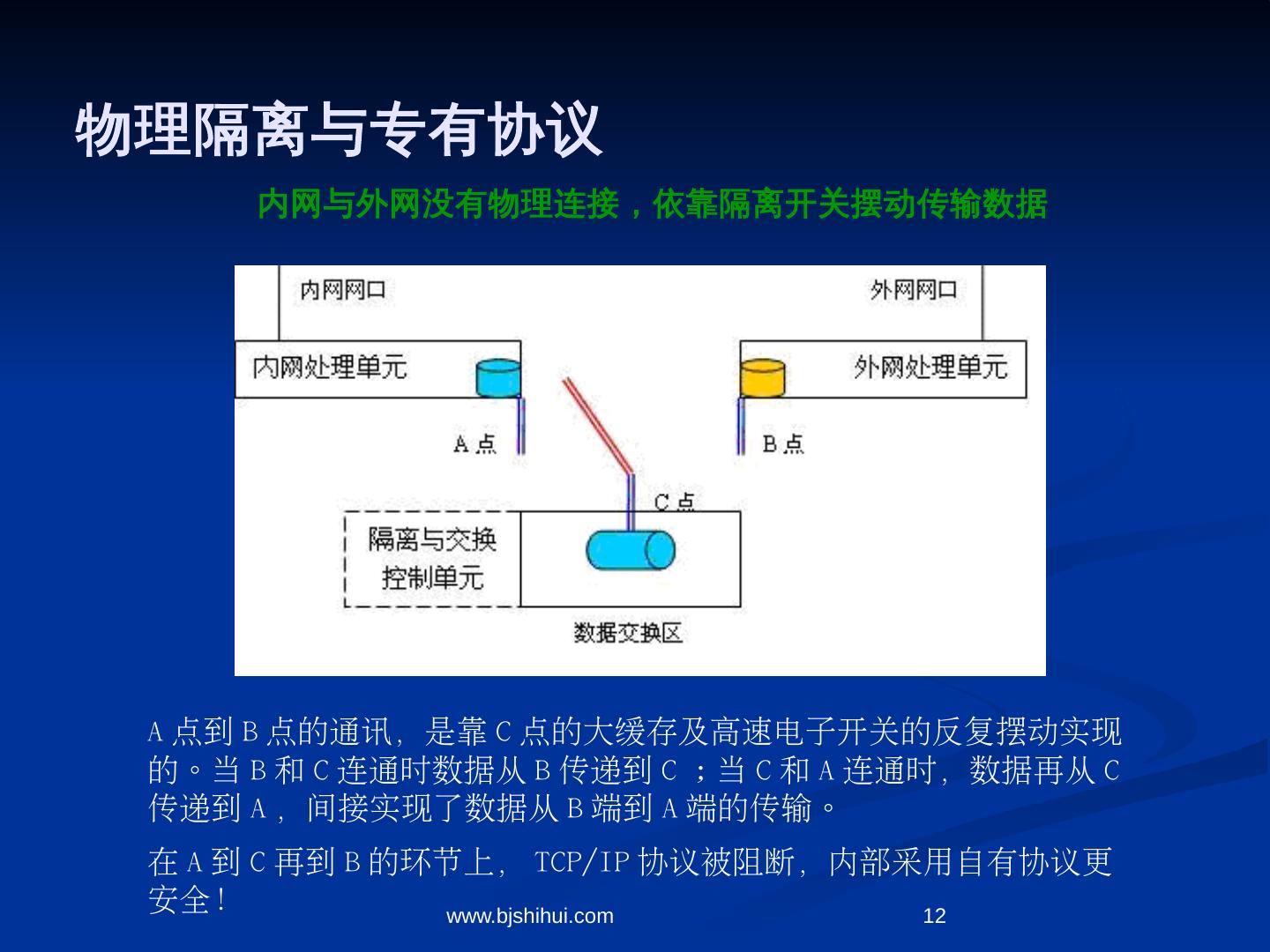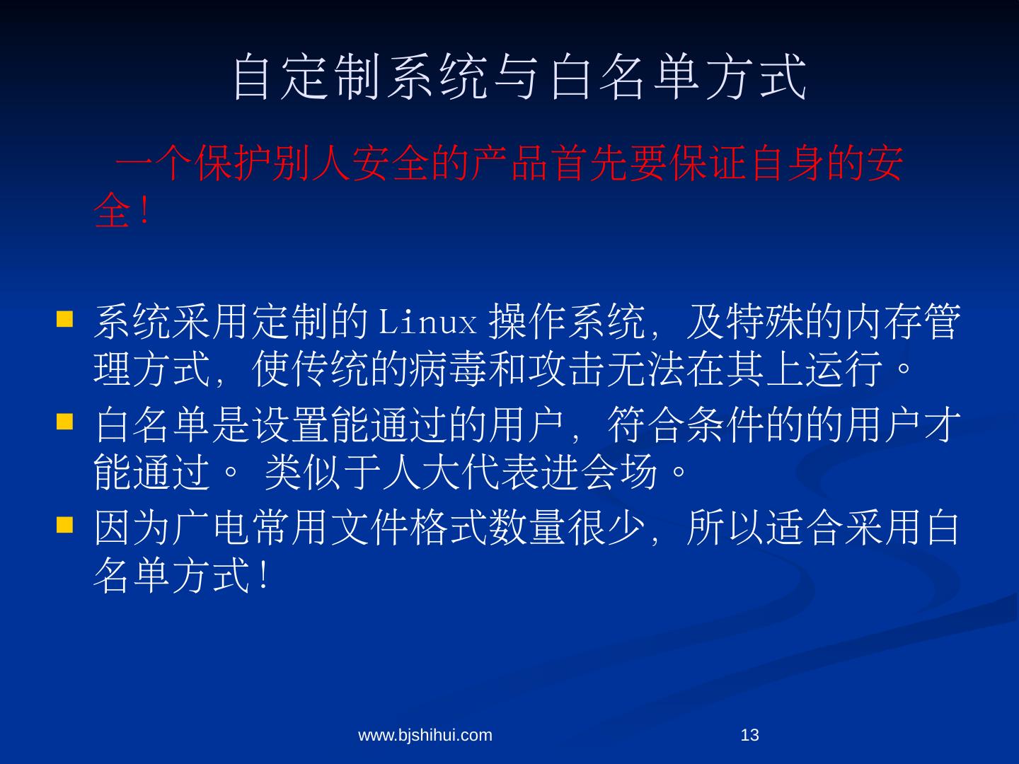 12 .物理隔离与专有协议 A 点到 B 点的通讯,是靠 C 点的大缓存及高速电子开关的反复摆动实现的。当 B 和 C 连通 时数据从 B 传递 到 C ; 当 C 和 A 连通 时,数据再从 C 传递 到 A , 间接实现了数据从 B 端到 A 端的 传输。 在 A 到 C 再到 B 的环节上, TCP/IP 协议被阻断,内部采用自有协议更安全! 内网与外网没有物理连接,依靠 隔离开关摆动传输 数据 www.bjshihui.com 12