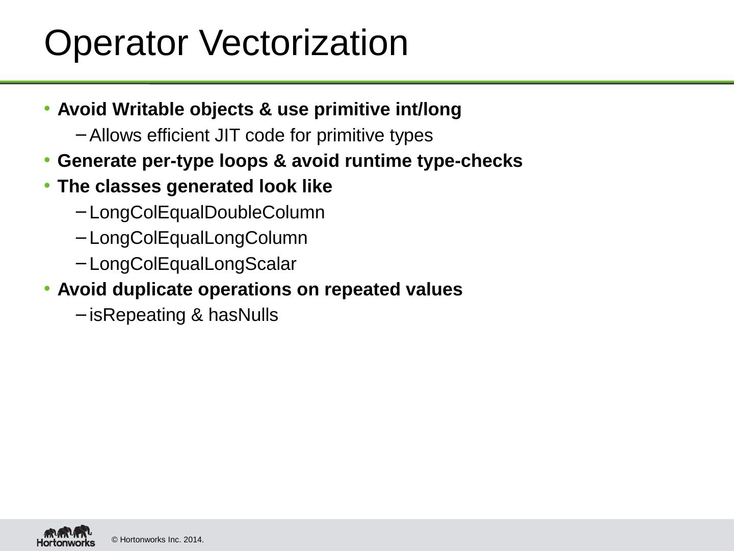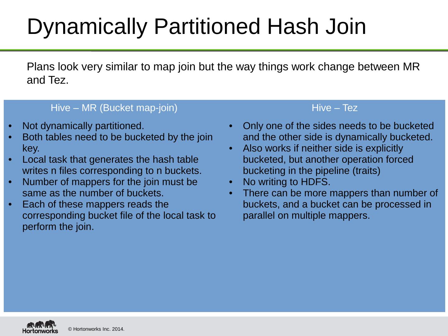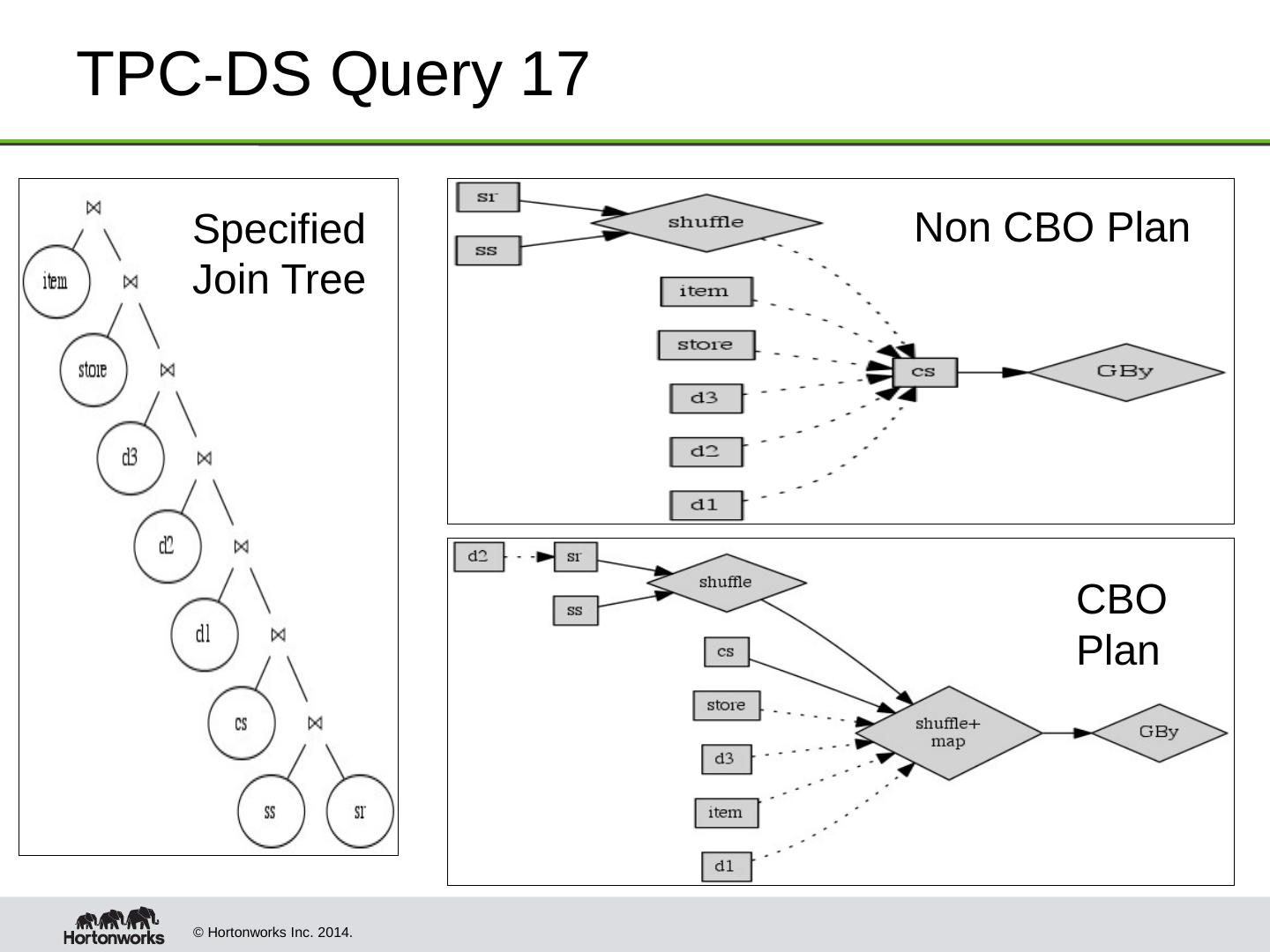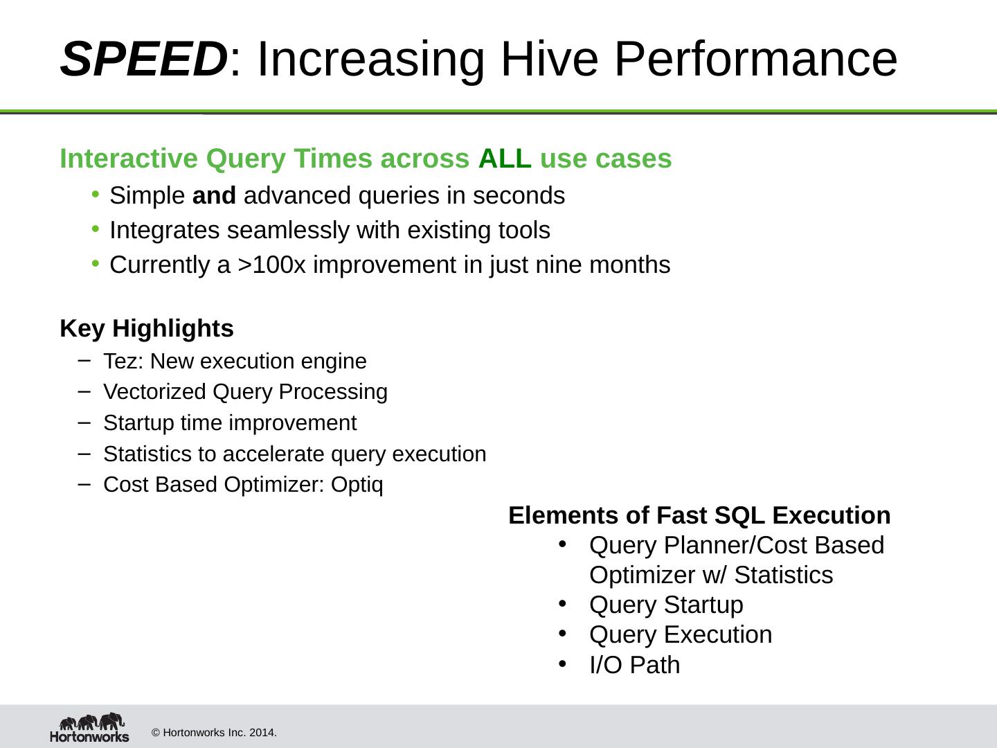 Hive on Apache Tez; Cost Based Optimizer (Optiq); Vectorized Processing ... Used by Apache Drill, Apache Cascading, Lucene DB; Based on Volcano paper ...