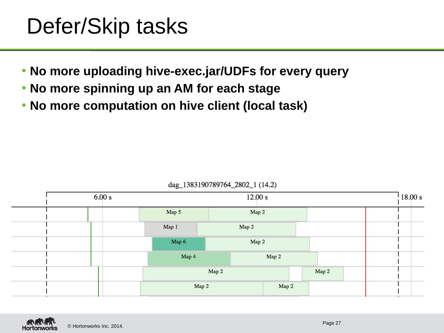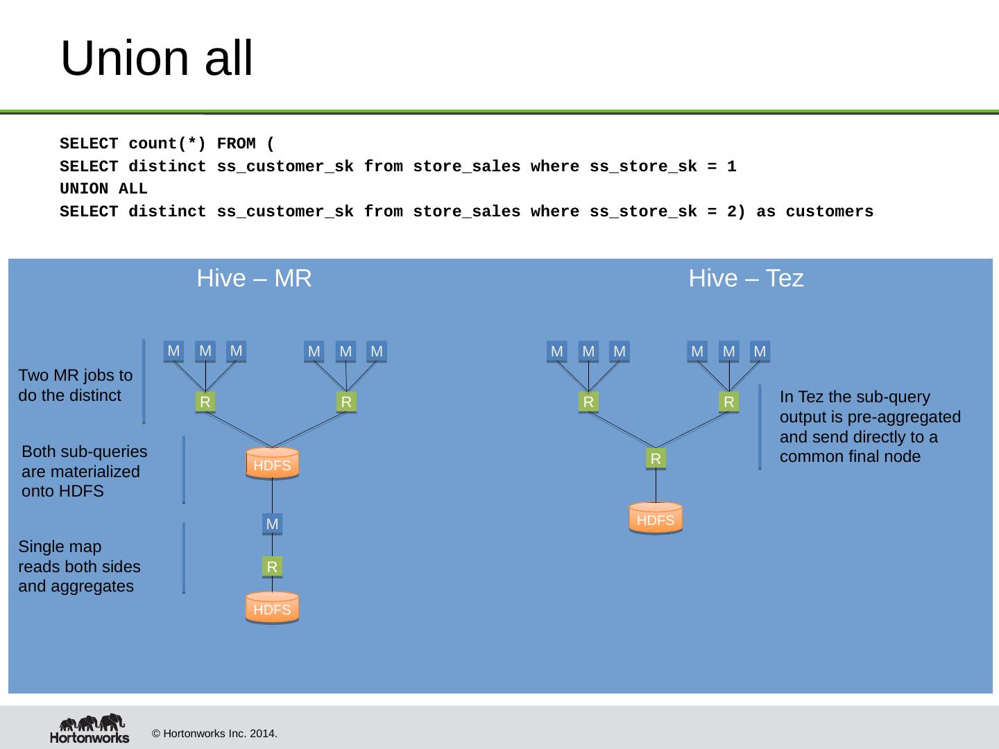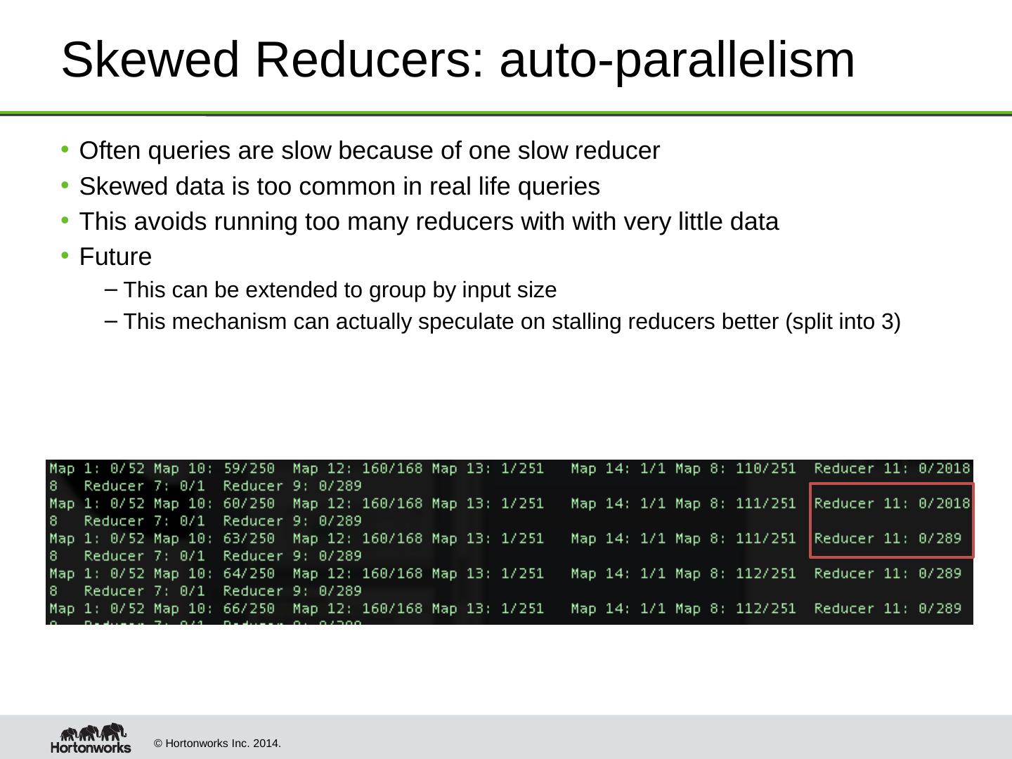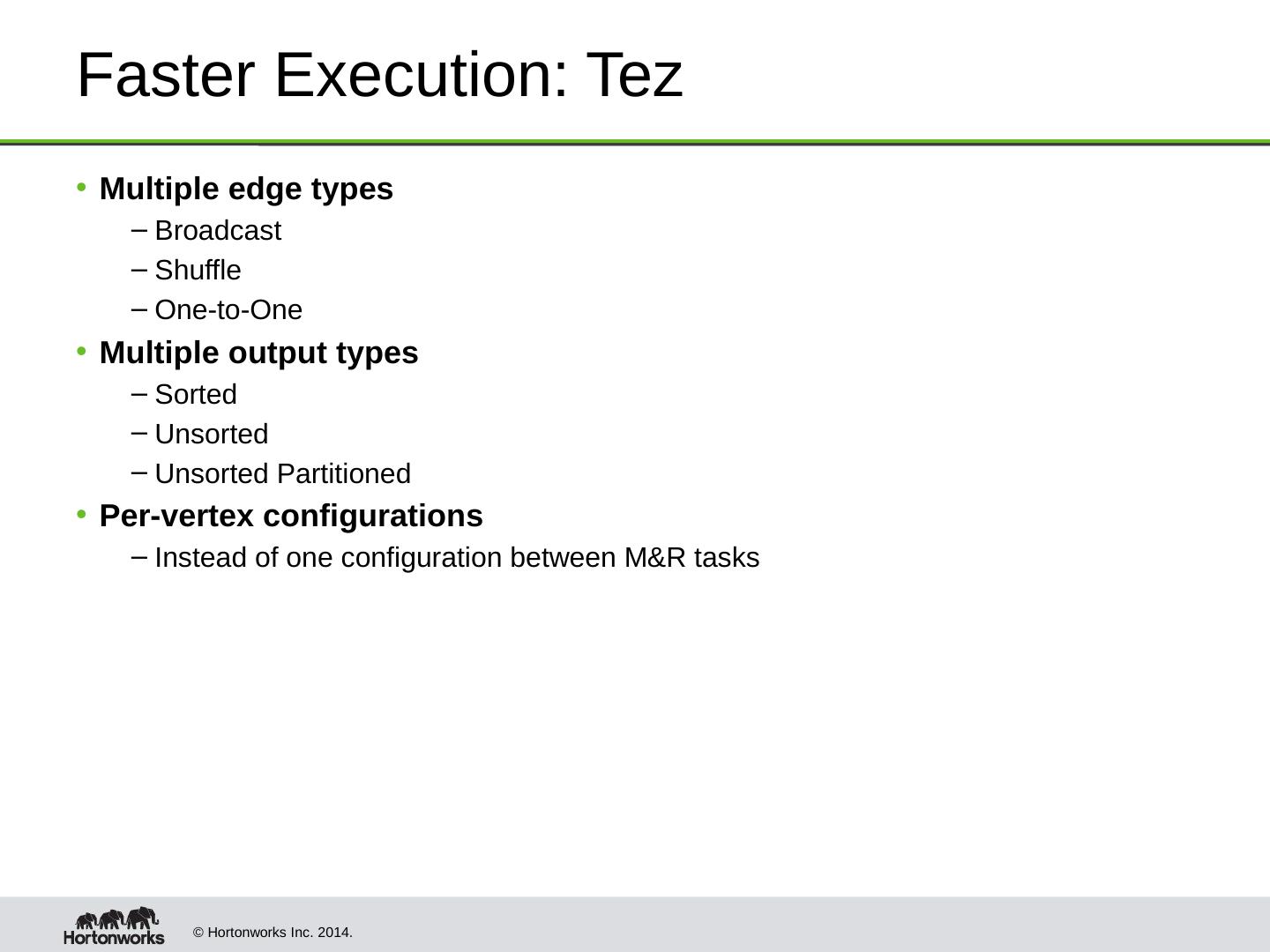 Hive on Apache Tez; Cost Based Optimizer (Optiq); Vectorized Processing ... Used by Apache Drill, Apache Cascading, Lucene DB; Based on Volcano paper ...