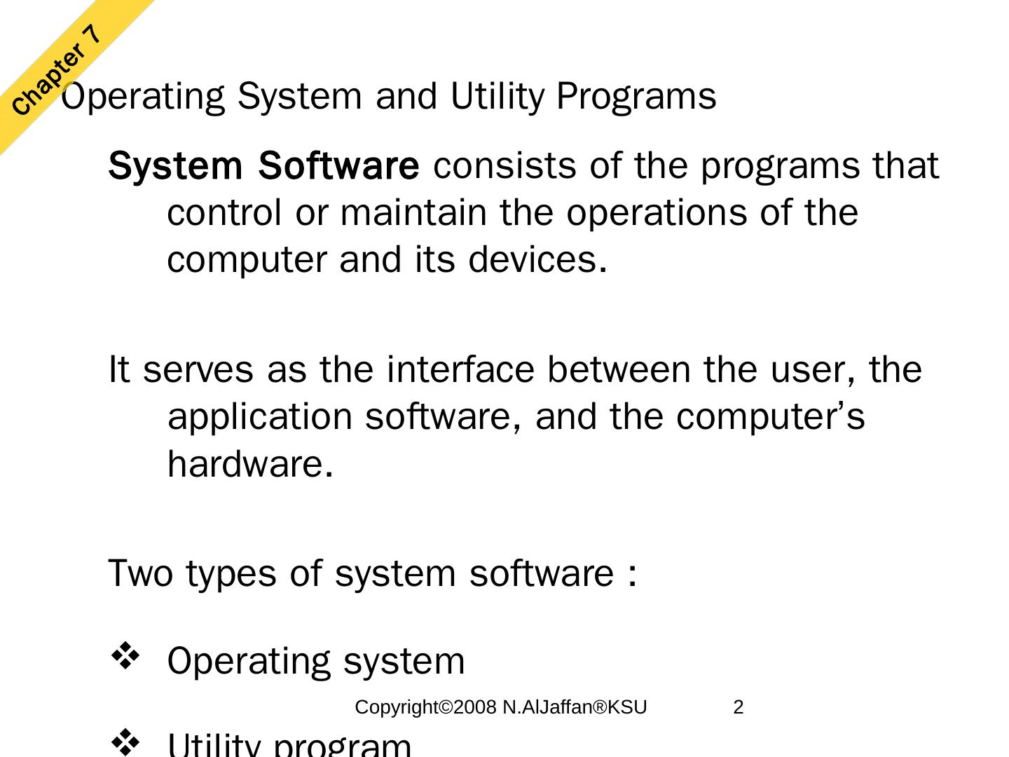 Operating System and Utility Programs. System Software consists of the programs that control or maintain the operations of the computer and its devices.
