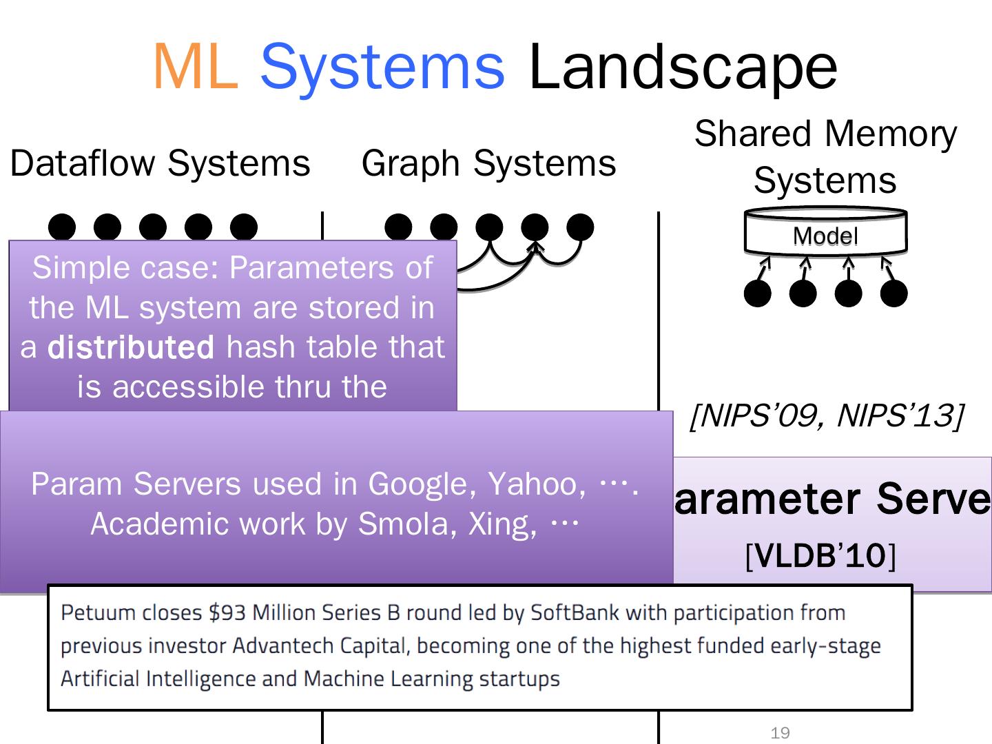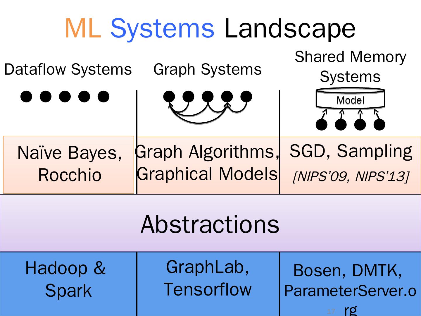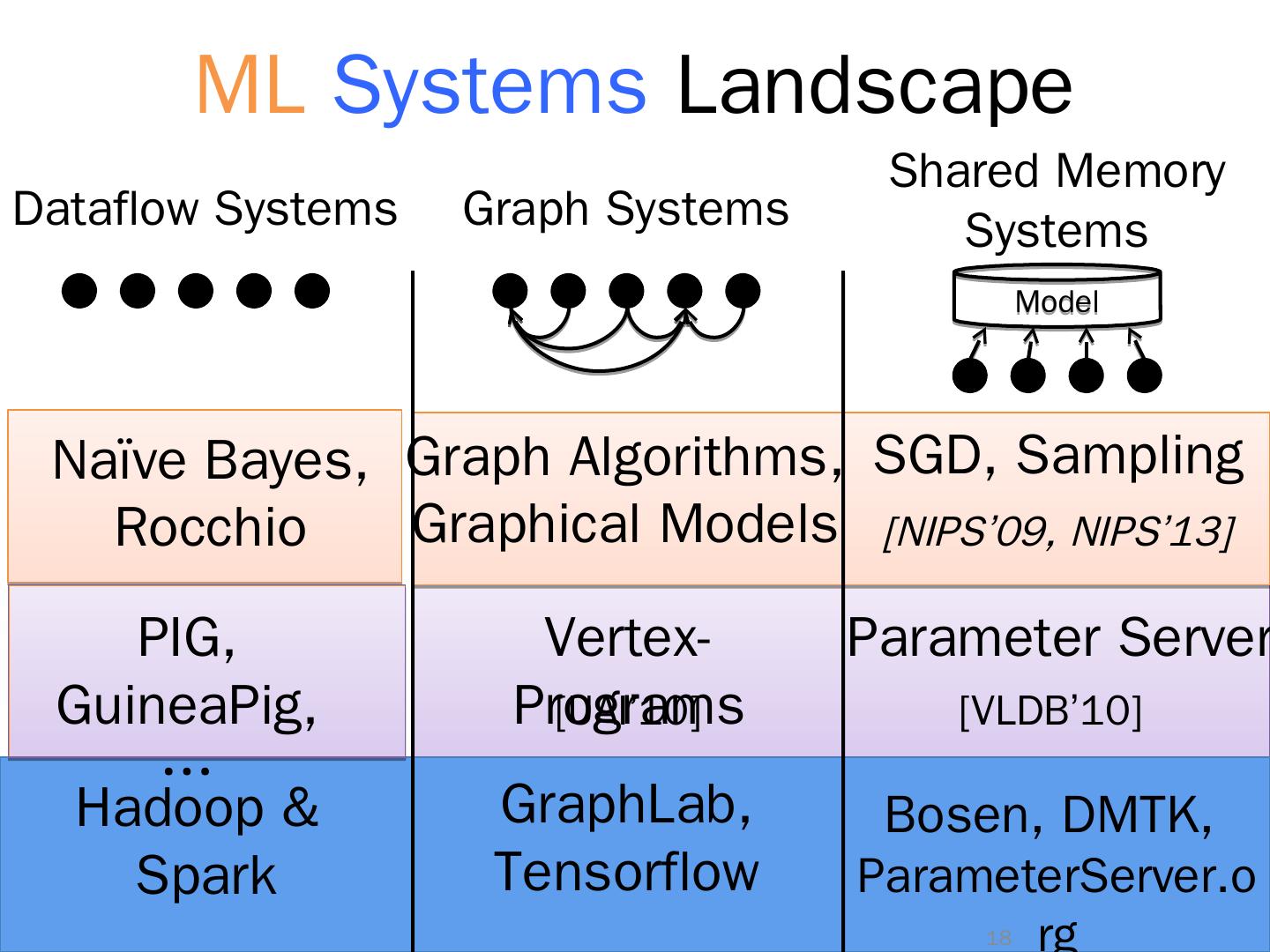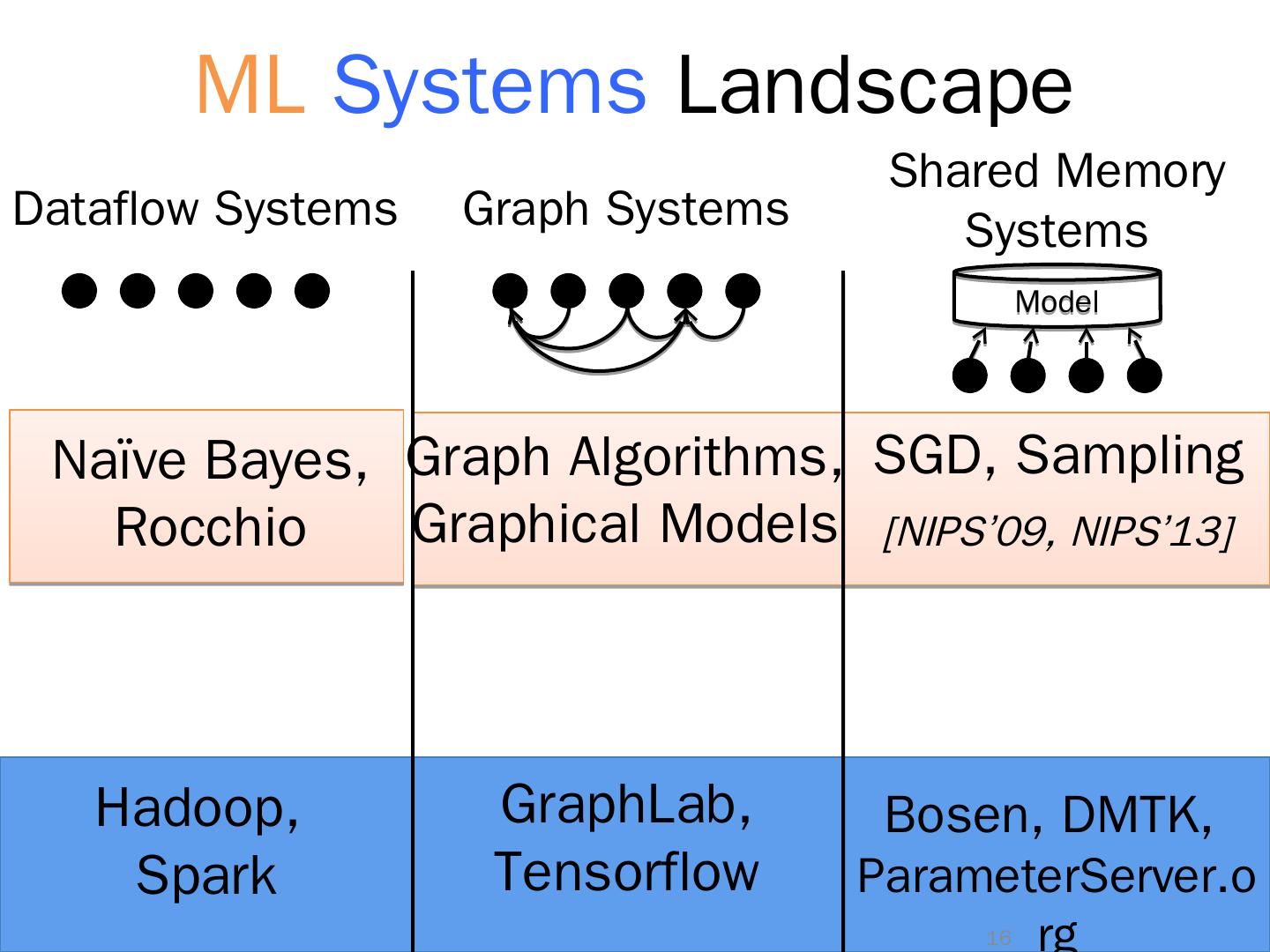 Tensorflow. Hadoop,. Spark. Bosen, DMTK,. ParameterServer.org. 14. ML Systems Landscape. Graph Systems. Dataflow Systems. Shared Memory Systems.