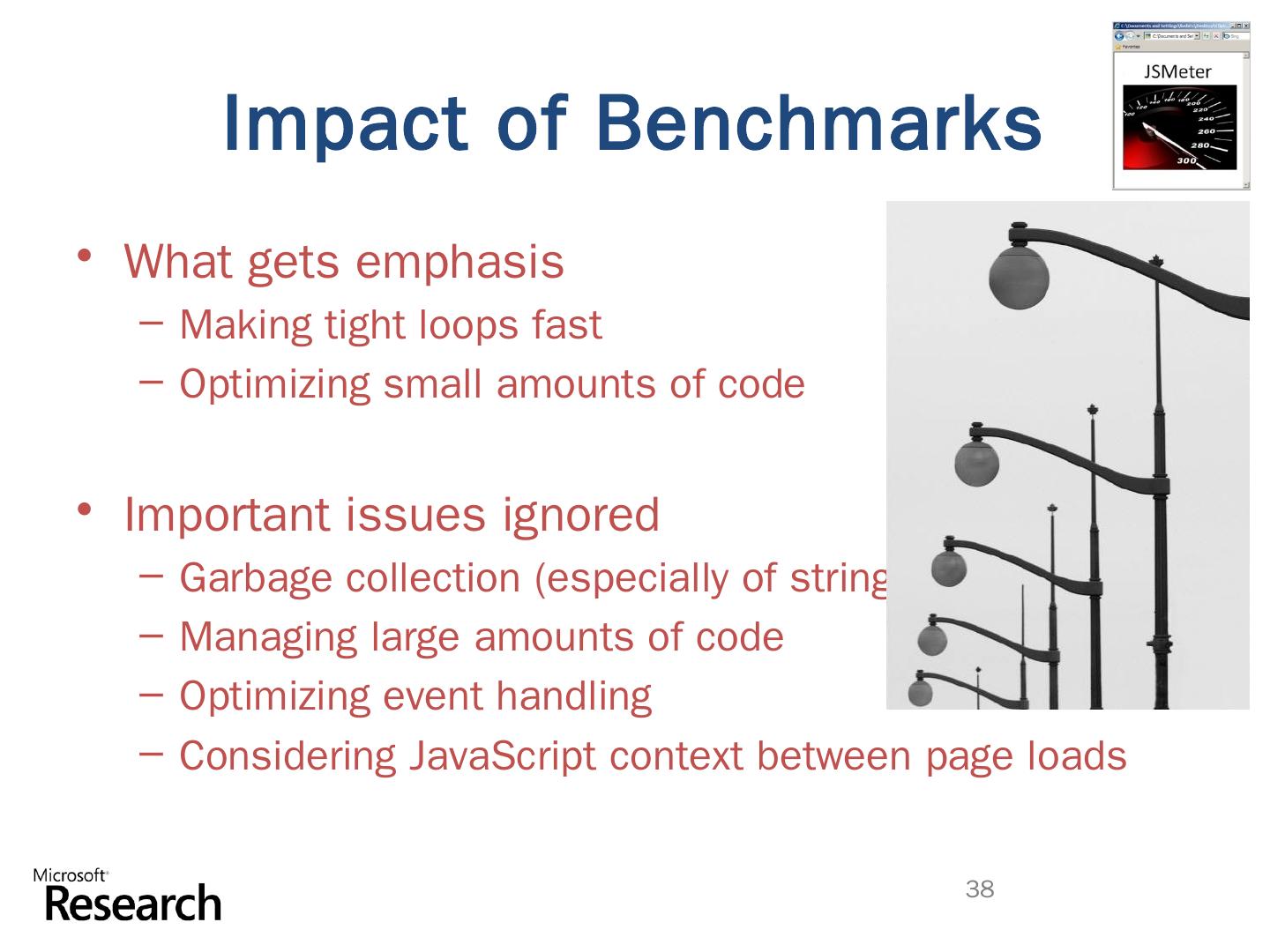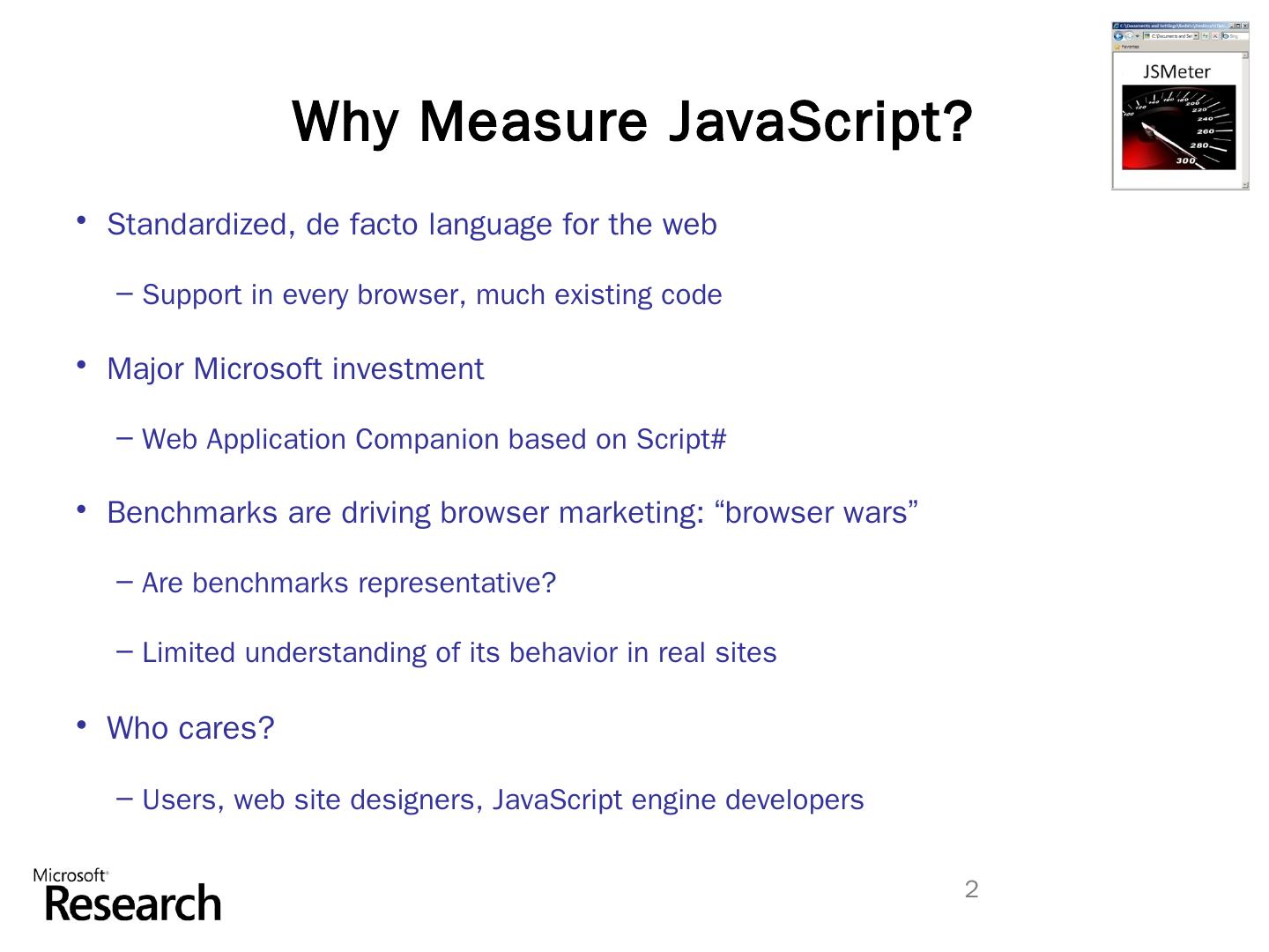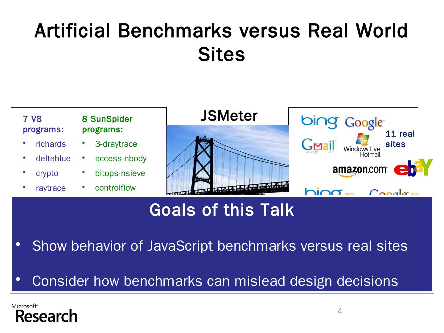 Are benchmarks representative? Limited understanding of its behavior in real sites. Who cares? Users, web site designers, JavaScript engine developers. 2. 3.
