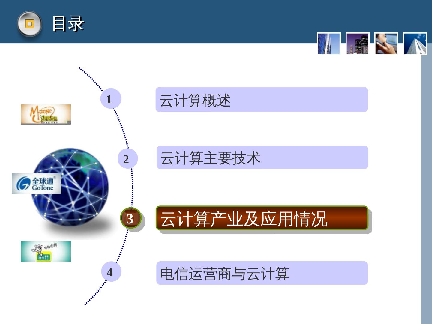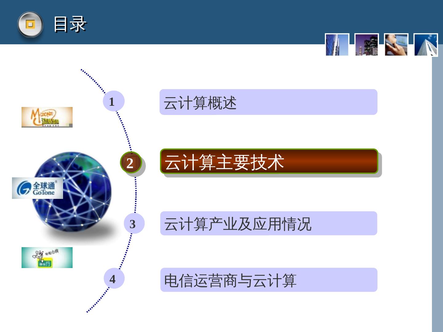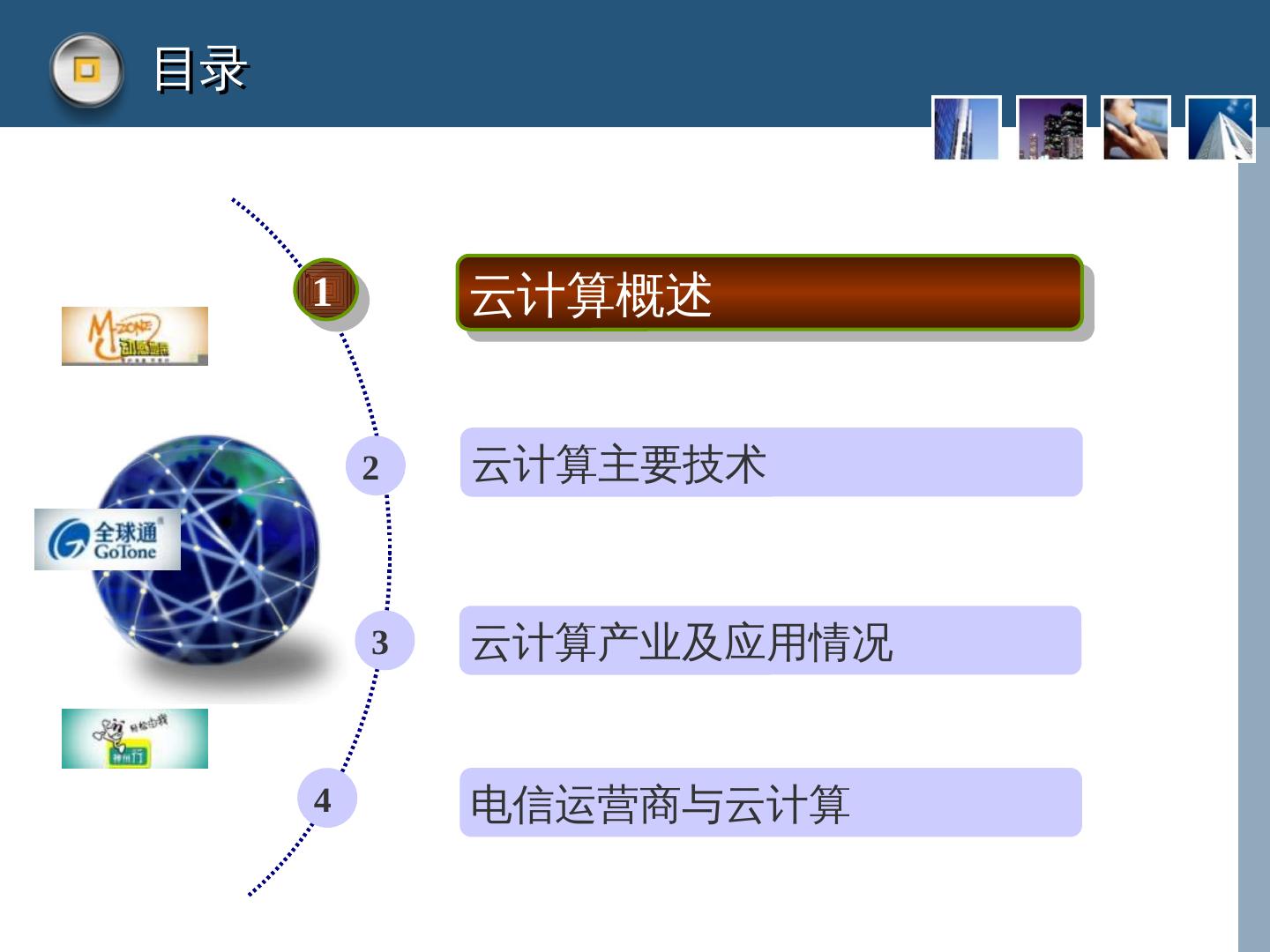 2 .目录 1 云计算概述 2 3 云计算主要技术 云计算产业及应用情况 电信运营商与云计算 4