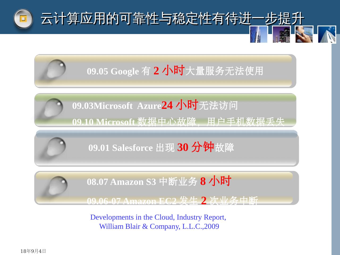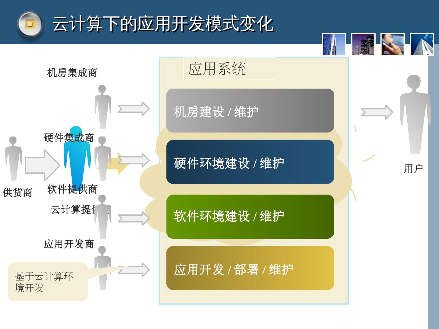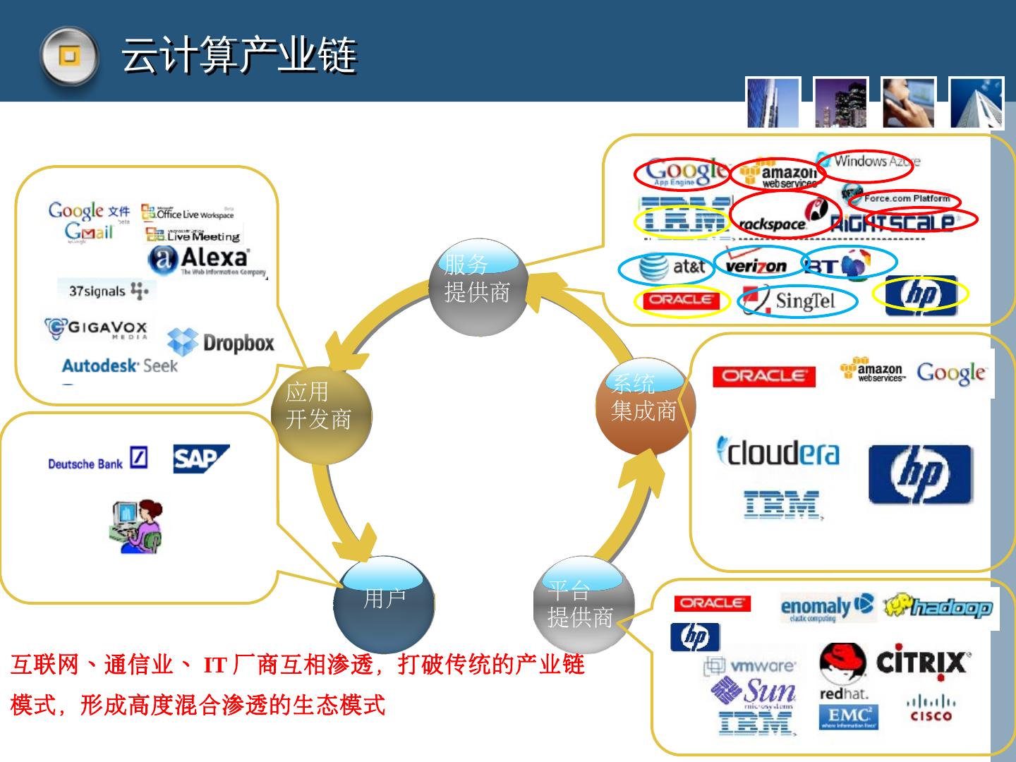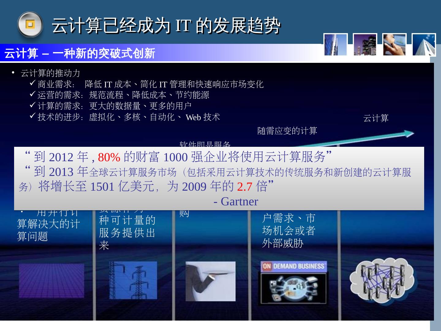 3 .云计算已经成为 IT 的发展趋势 行业环境分析 云计算 – 一种新的突破式创新 云计算 随需应变的计算 软件即是服务 效用计算 网格计算 • 基于网络的应用订购 • 把计算资源作为一种可计量的服务提供出来 • 用并行计算解决大的计算问题 • 整合的端到端业务,能够快速响应任何客户需求、市场机会或者外部威胁 • 在任何时间、任何地点访问动态提供的 IT 资源 云计算的推动力 商业需求: 降低 IT 成本、简化 IT 管理和快速响应市场变化 运营的需求:规范流程、降低成本、节约能源 计算的需求:更大的数据量、更多的用户 技术的进步:虚拟化、多核、自动化、 Web 技术 “ 到 2012 年 , 80% 的财富 1000 强企业将使用云计算服务” “到 2013 年 全球云计算服务市场(包括采用云计算技术的传统服务和新创建的云计算服务) 将增长至 1501 亿美元,为 2009 年的 2.7 倍” - Gartner