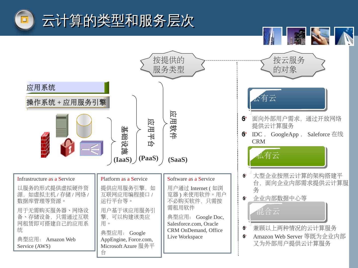 6 .云计算的类型和服务层次 私有云 公有云 混合云 操作系统 + 应用服务引擎 应用系统 基础设施 (IaaS) 应用平台 (PaaS) 应用软件 (SaaS) I nfrastructure a s a S ervice 以服务的形式提供虚拟硬件资源,如虚拟主机 / 存储 / 网络 / 数据库管理等资源。 用于无需购买服务器、网络设备、存储设备,只需通过互联网租赁即可搭建自己的应用系统 典型应用: Amazon Web Service (AWS) P latform a s a S ervice 提供应用服务引擎,如互联网应用编程接口 / 运行平台等。 用户基于该应用服务引擎,可以构建该类应用。 典型应用: Google AppEngine , Force.com, Microsoft Azure 服务平台 S oftware a s a S ervice 用户通过 Internet ( 如浏览器 ) 来使用软件。用户不必购买软件,只需按需租用软件 典型应用: Google Doc, Salesforce.com, Oracle CRM OnDemand , Office Live Workspace 面向外部用户需求,通过开放网络提供云计算服务 IDC , GoogleApp , Saleforce 在线 CRM 按提供的服务类型 按云服务的对象 大型企业按照云计算的架构搭建平台,面向企业内部需求提供云计算服务 企业内部数据中心等 兼顾以上两种情况的云计算服务 Amazon Web Server 等既为企业内部又为外部用户提供云计算服务