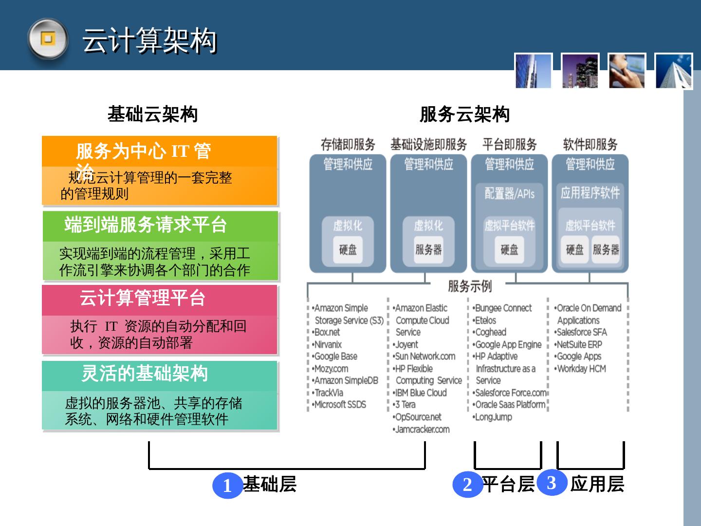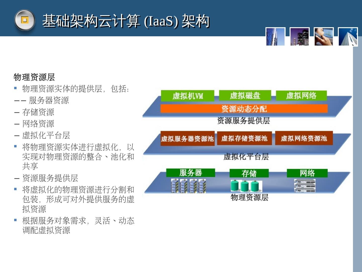 16 .基础架构云计算 ( IaaS ) 架构 物理资源层 物理资源实体的提供层,包括: −−服务器资源 −存储资源 −网络资源 −虚拟化平台层 将物理资源实体进行虚拟化,以实现对物理资源的整合、池化和共享 −资源服务提供层 将虚拟化的物理资源进行分割和包装,形成可对外提供服务的虚拟资源 根据服务对象需求,灵活、动态调配虚拟资源