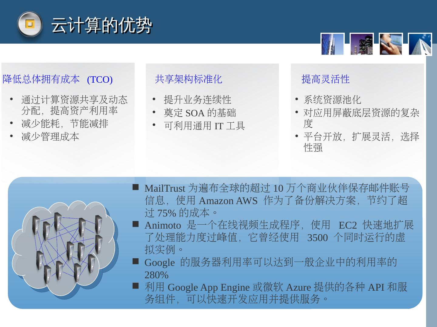 9 .云计算的优势 降低总体拥有成本 (TCO) 通过计算资源共享及动态分配,提高资产利用率 减少能耗,节能减排 减少管理成本 共享架构标准化 提升业务连续性 奠定 SOA 的基础 可利用通用 IT 工具 提高灵活性 系统资源池化 对应用屏蔽底层资源的复杂度 平台开放,扩展灵活,选择性强 MailTrust 为遍布全球的超过 10 万个商业伙伴保存邮件账号信息,使用 Amazon AWS 作为了备份解决方案,节约了超过 75% 的成本。 Animoto 是一个在线视频生成程序,使用 EC2 快速地扩展了处理能力度过峰值,它曾经使用 3500 个同时运行的虚拟实例。 Google 的服务器利用率可以达到一般企业中的利用率的 280% 利用 Google App Engine 或微软 Azure 提供的各种 API 和服务组件,可以快速开发应用并提供服务。
