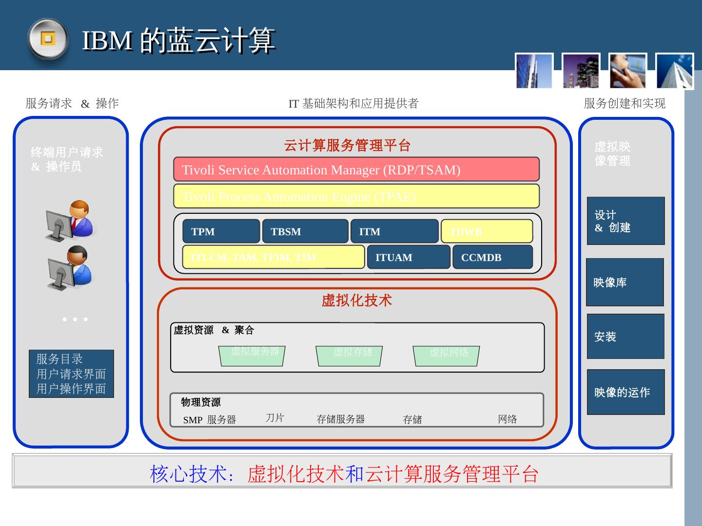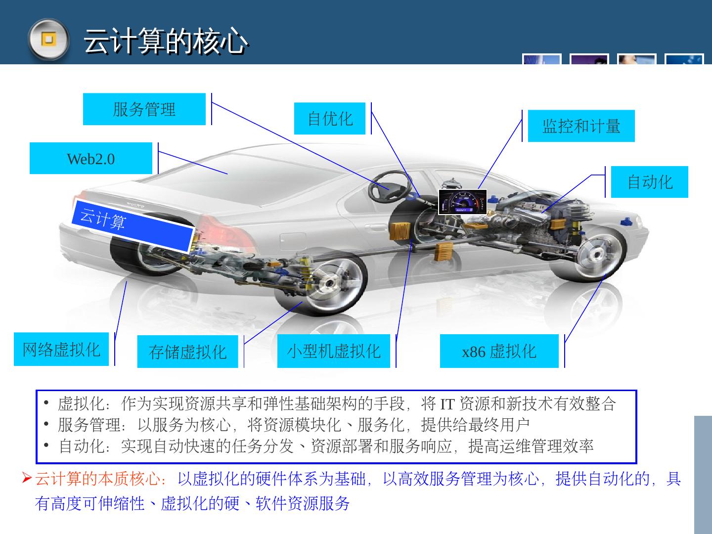 10 .云计算的核心 云计算的运营定义 自优化 x86 虚拟化 小型机虚拟化 网络虚拟化 存储虚拟化 自动化 监控和计量 服务管理 云计算 Web2.0 虚拟化: 作为实现资源共享和弹性基础架构的手段,将 IT 资源和新技术有效整合 服务管理: 以服务为核心,将资源模块化、服务化,提供给最终用户 自动化: 实现自动快速的任务分发、资源部署和服务响应,提高运维管理效率 云计算的本质核心: 以虚拟化的硬件体系为基础,以高效服务管理为核心,提供自动化的,具有高度可伸缩性、虚拟化的硬、软件资源服务
