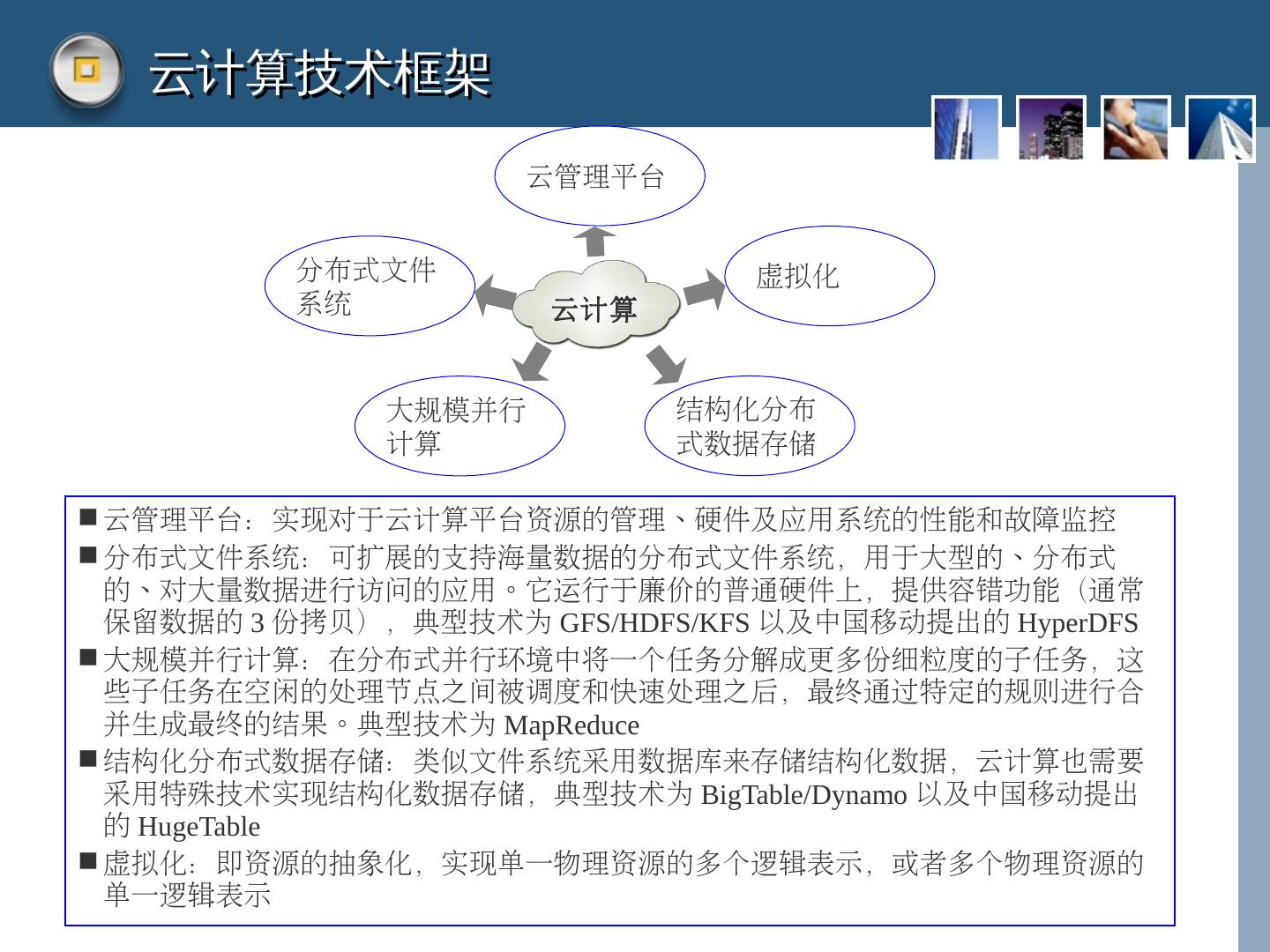11 .云计算技术框架 分布式文件系统 大规模并行计算 结构化分布式数据存储 虚拟化 云计算 云管理平台: 实现对于云计算平台资源的管理、硬件及应用系统的性能和故障监控 分布式文件系统: 可扩展的支持海量数据的分布式文件系统,用于大型的、分布式的、对大量数据进行访问的应用。它运行于廉价的普通硬件上,提供容错功能(通常保留数据的 3 份拷贝),典型技术为 GFS/HDFS/KFS 以及中国移动提出的 HyperDFS 大规模并行计算 :在分布式并行环境中将一个任务分解成更多份细粒度的子任务,这些子任务在空闲的处理节点之间被调度和快速处理之后,最终通过特定的规则进行合并生成最终的结果。典型技术为 MapReduce 结构化分布式数据存储: 类似文件系统采用数据库来存储结构化数据,云计算也需要采用特殊技术实现结构化数据存储,典型技术为 BigTable/Dynamo 以及中国移动提出的 HugeTable 虚拟化: 即资源的抽象化,实现单一物理资源的多个逻辑表示,或者多个物理资源的单一逻辑表示 云管理平台