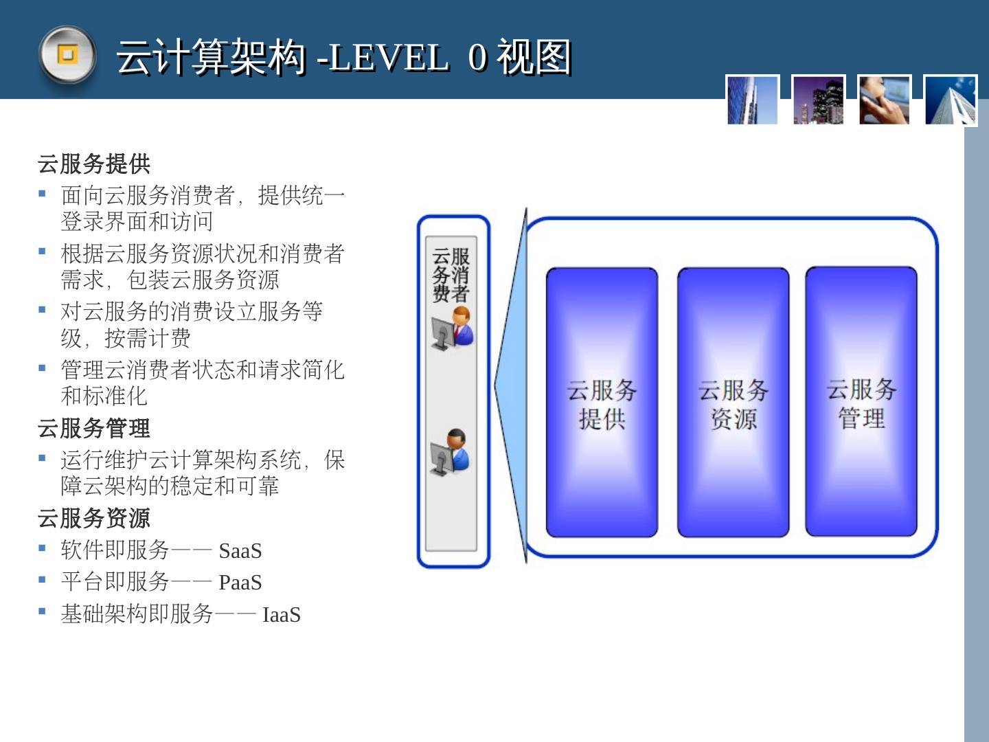 12 .云计算架构 -LEVEL 0 视图 云服务提供 面向云服务消费者,提供统一登录界面和访问 根据云服务资源状况和消费者需求,包装云服务资源 对云服务的消费设立服务等级,按需计费 管理云消费者状态和请求 简化 和 标准化 云服务管理 运行维护云计算架构系统,保障云架构的稳定和可靠 云服务资源 软件即服务 —— SaaS 平台即服务 —— PaaS 基础架构即服务 —— IaaS