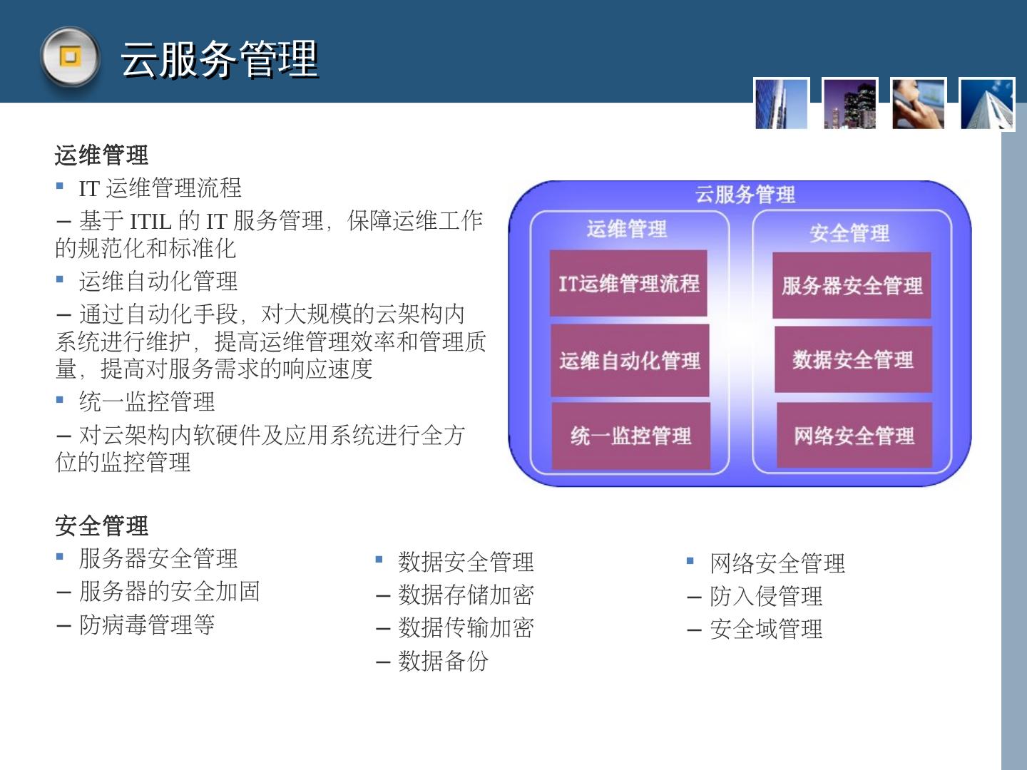 15 .云服务管理 运维管理 IT 运维管理流程 −基于 ITIL 的 IT 服务管理,保障运维工作的规范化和标准化 运维自动化管理 −通过自动化手段,对大规模的云架构内系统进行维护,提高运维管理效率和管理质量,提高对服务需求的响应速度 统一监控管理 −对云架构内软硬件及应用系统进行全方位的监控管理 安全管理 服务器安全管理 −服务器的安全加固 −防病毒管理等 数据安全管理 −数据存储加密 −数据传输加密 −数据备份 网络安全管理 −防入侵管理 −安全域管理
