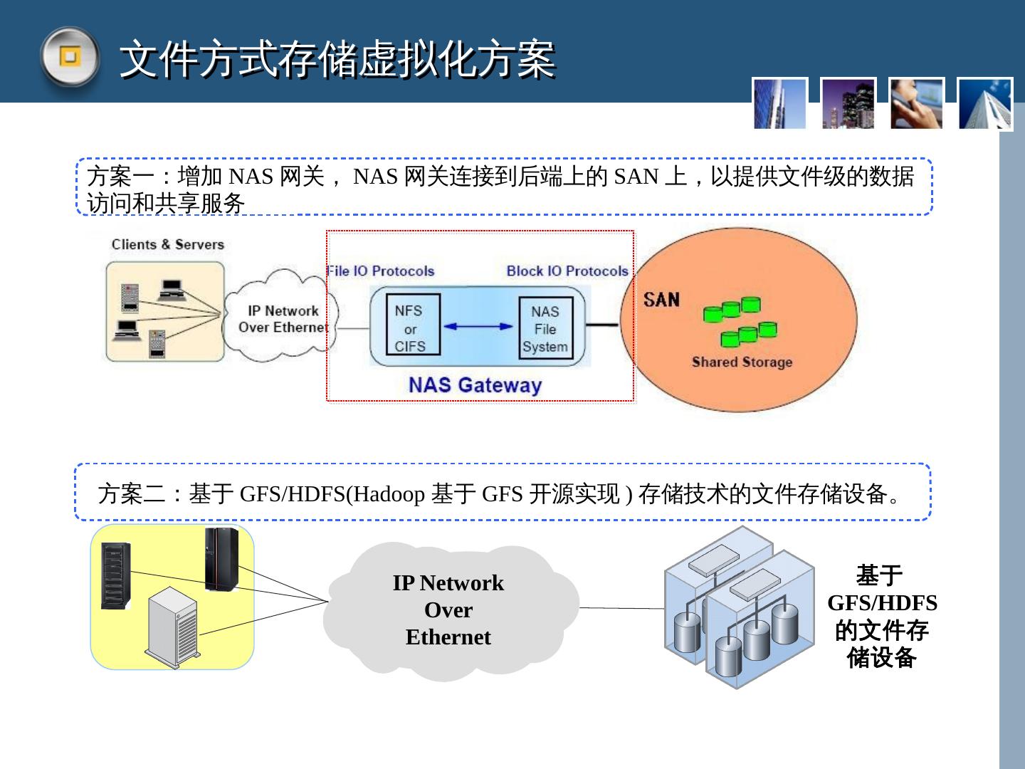 27 .方案一:增加 NAS 网关, NAS 网关连接到后端上的 SAN 上,以提供文件级的数据访问和共享服务 IP Network Over Ethernet 基于 GFS/HDFS 的文件存储设备 方案二:基于 GFS/HDFS ( Hadoop基于GFS开源实现 ) 存储技术的文件 存储设备。 文件方式存储虚拟化方案