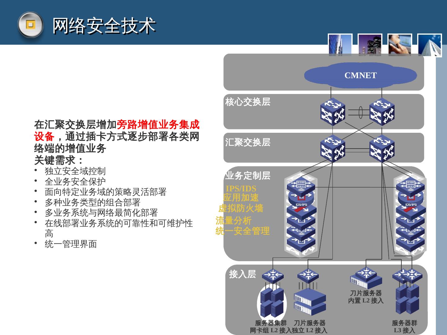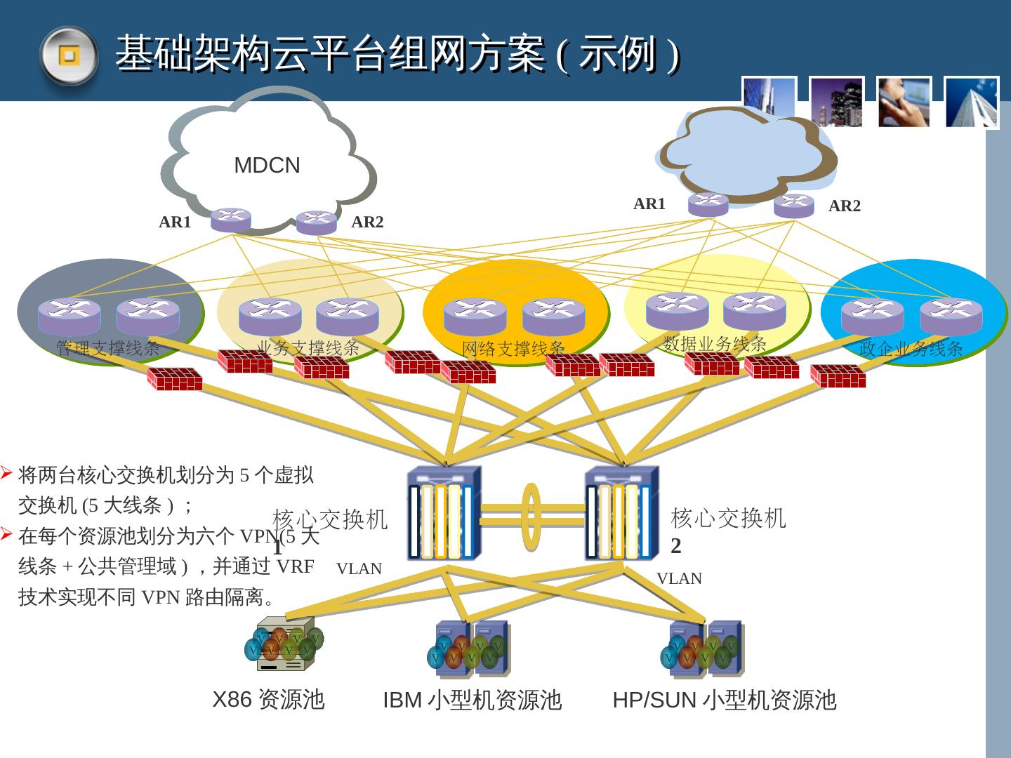 29 .网络技术 线路图 现阶段 千兆以太网上联 存储和 IP 分离 第一阶段:接入交换机整合 服务器上联融合,降低运维成本 要求万兆 FCoE 网络上联 存储和 IP 部分融合 第二阶段: IP 存储完全融合 IP 和存储完全融合 ,降低运维成本 要求万兆 FCoE 网络上联 FC IP 1G FC 存储设备 存储交换机 以太网交换机 服务器 以太网交换机 FC IP 10G FCoE 10G FC 存储设备 存储交换机 以太网交换机 服务器 新一代 以太网交换机 FC IP 10G FCoE 存储设备 以太网交换机 服务器 新一代 以太网交换机 10G FCoE