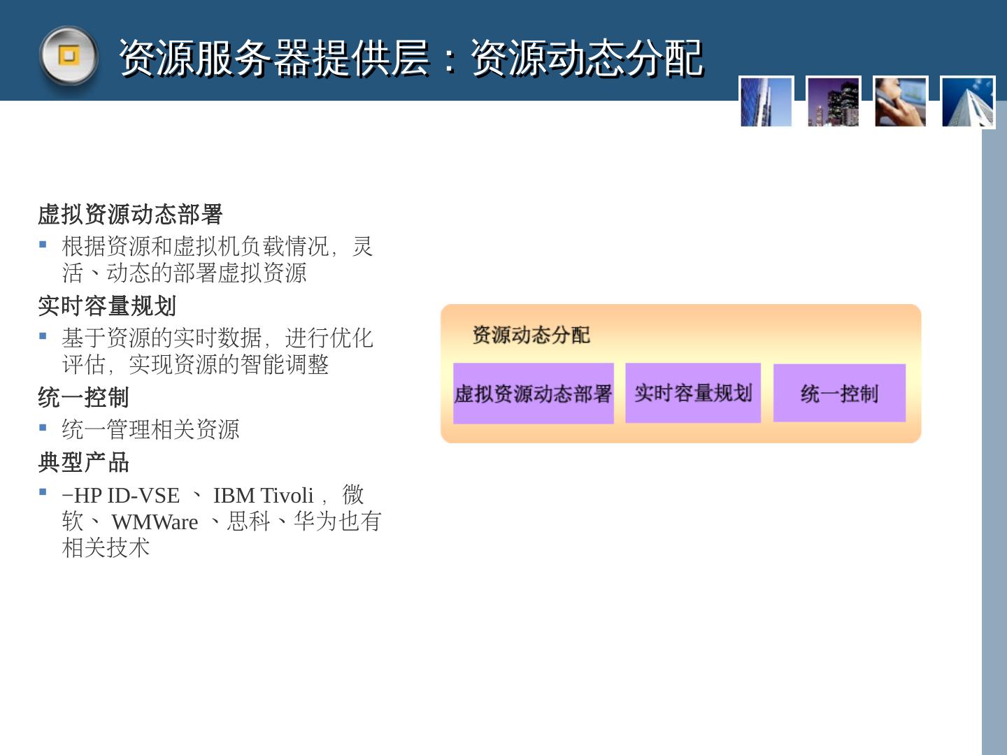 7 . 规范云计算管理的一套完整的管理规则 实现端到端的流程管理,采用工作流引擎来协调各个部门的合作 执行 IT 资源的自动分配和回收,资源的自动部署 虚拟的服务器池、共享的存储系统、网络和硬件管理软件 服务为中心 IT 管治 端到端服务请求平台 云计算管理平台 灵活的基础架构 基础云架构 服务云架构 基础层 平台层 应用层 云计算架构 1 2 3