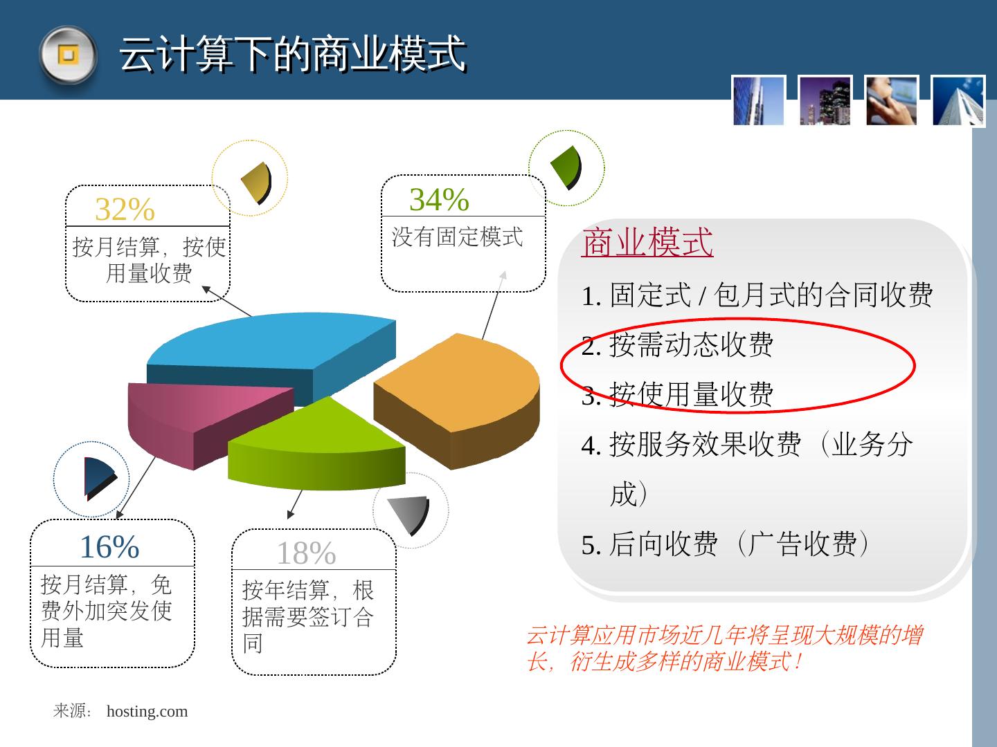 4 .云计算定义 云计算的运营定义 云计算是一个方便灵活的计算模式,它是按需,可通过网络进行访问和使用的计算资源的共享池(例如,网络,服务器,存储,应用程序服务),它以用最少的管理付出,与服务供应商有最少的交互的前提下,可以达到将各种计算资源迅速的配置和推出。 (该定义来自 NIST 由美国政府的国家标准和技术部门针对云计算的定义发表的最新草案) 云 的提供角度 虚拟 化 资源 高自动化 简化 和 标准化 动态调整 0 的成本 增长 云的用户角度 简单 到 实用 单位 付 费 资产 变成 费用 标准 付 费 灵活交付 云计算是一种新兴的 IT 交付方式 , 应用 , 数据 , 和 IT 资源能够通过网络作为标准服务在灵活的价格下快速的提供最终用户 云计算是一种对大数量的虚拟资源 , 从管理上 , 能够自动集中简化和灵活的来提供服务 .