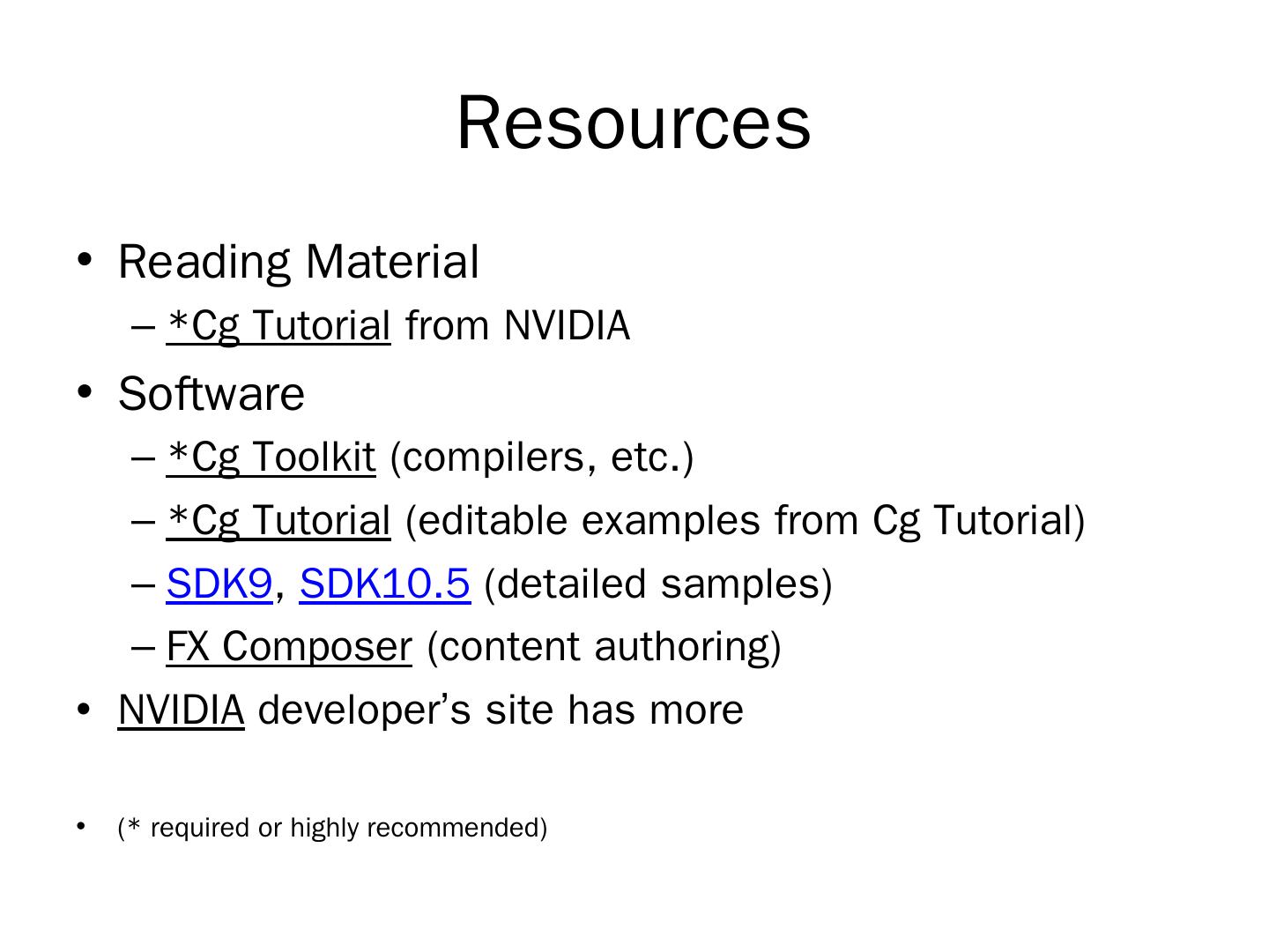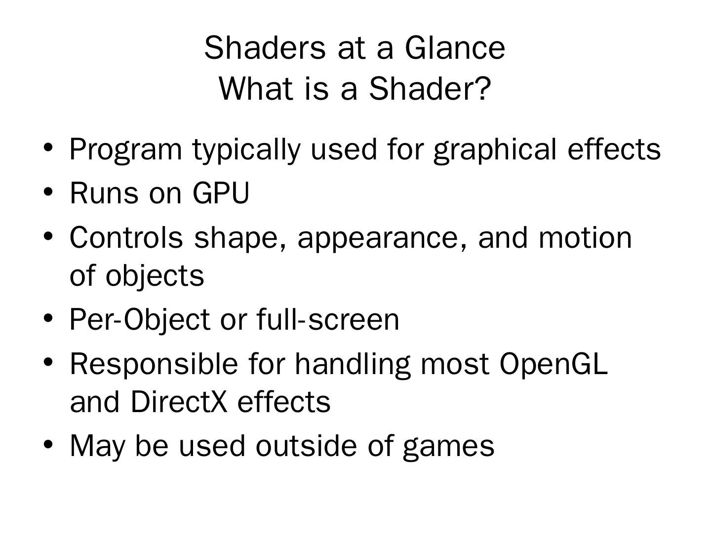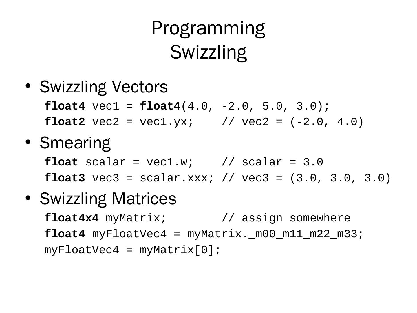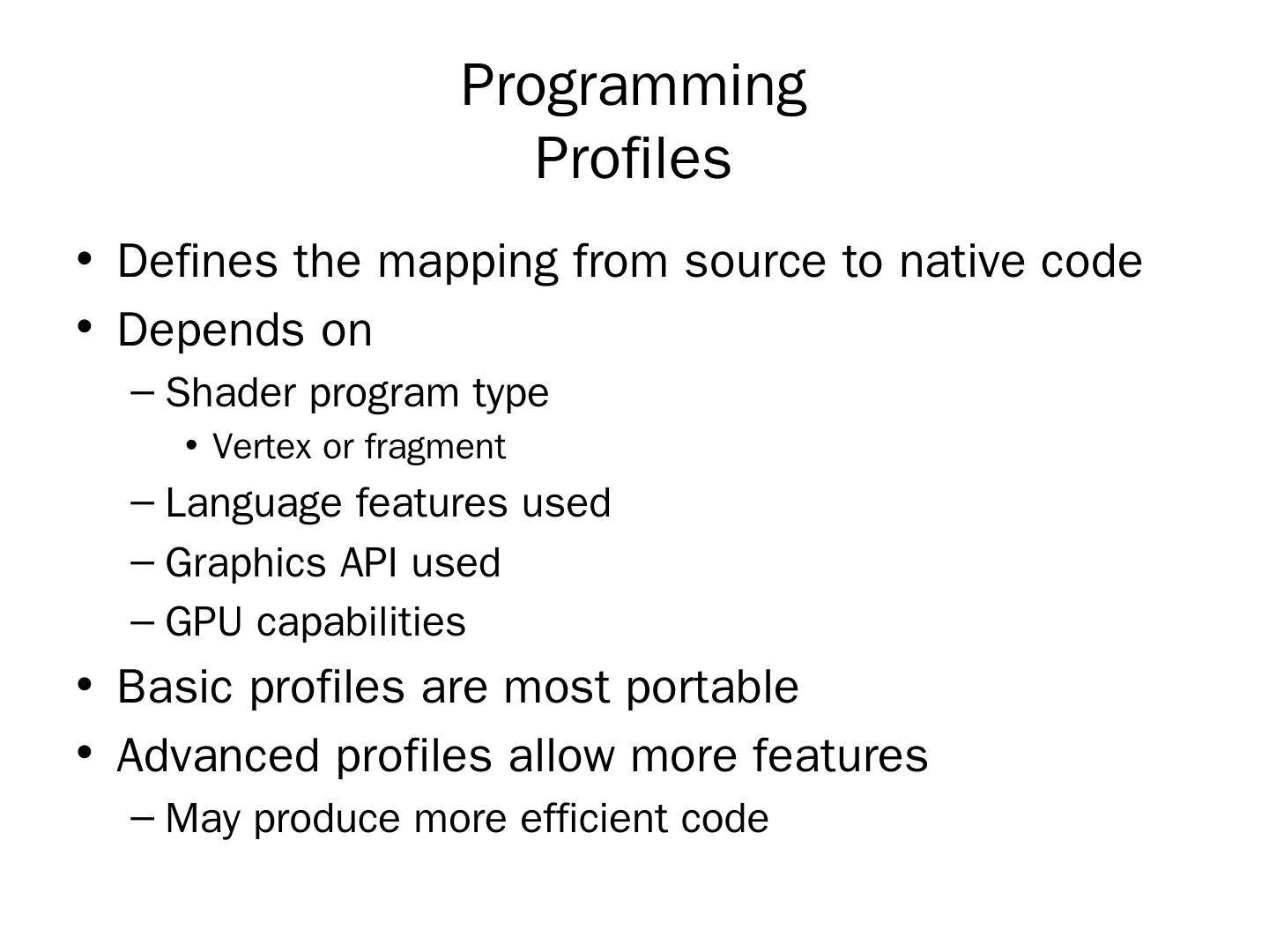 NVIDIA's implementation; OpenGL or Direct3D. High-Level Shading Language (HLSL). Microsoft's implementation; Direct3D. Programming Compilation.
