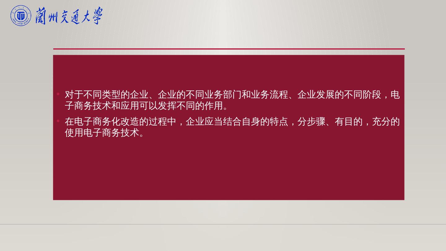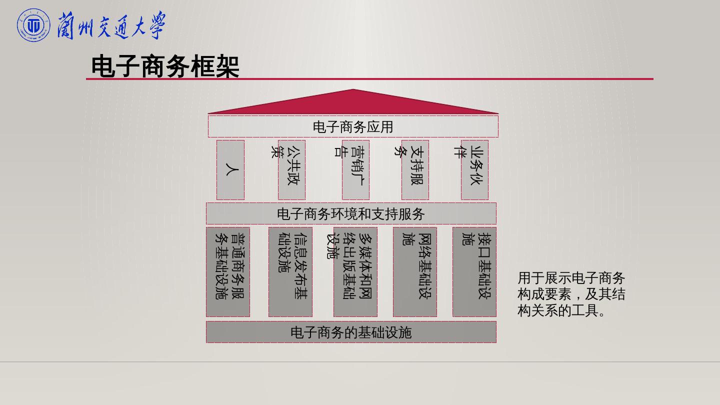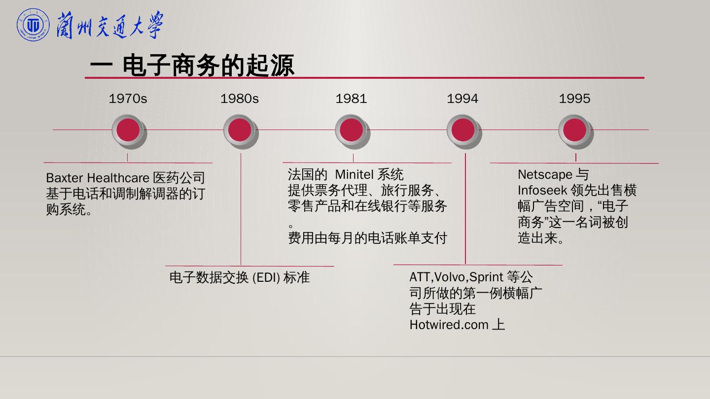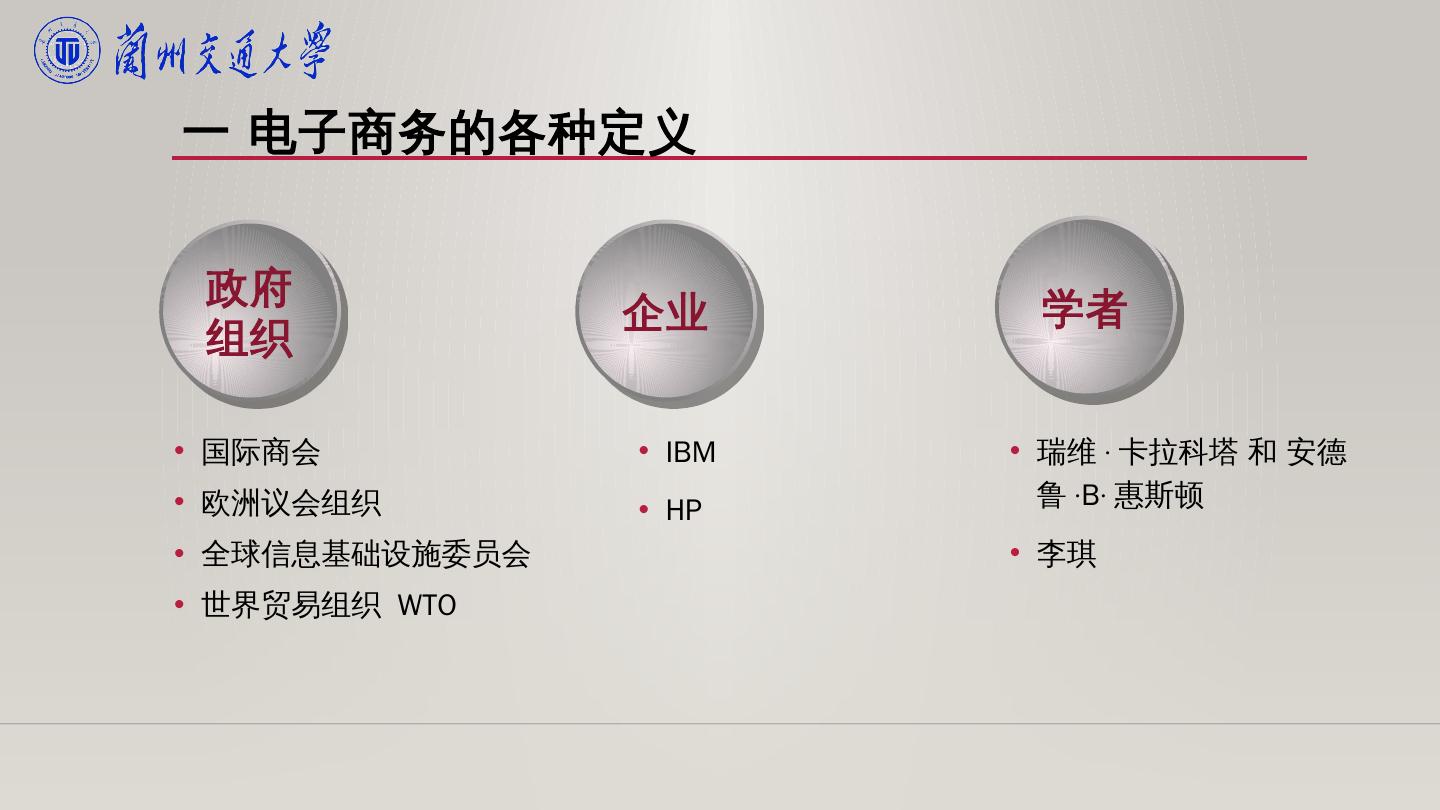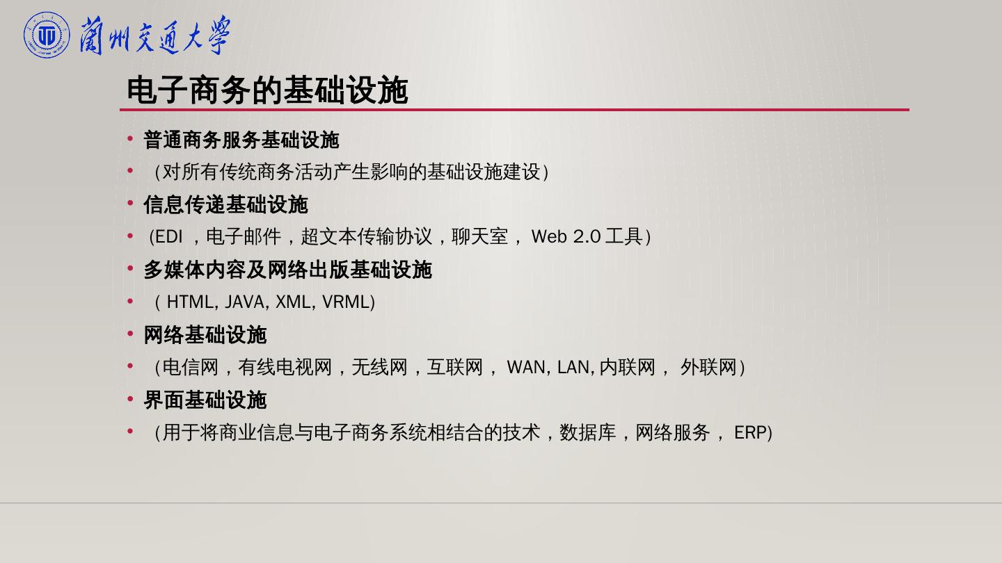 第一章 电子商务概论 ... 利用计算机和信息系统使大部分经营流程自动化运作的企业 ... 设施; (用于将商业信息与电子商务系统相结合的技术,数据库,网络服务,ERP).